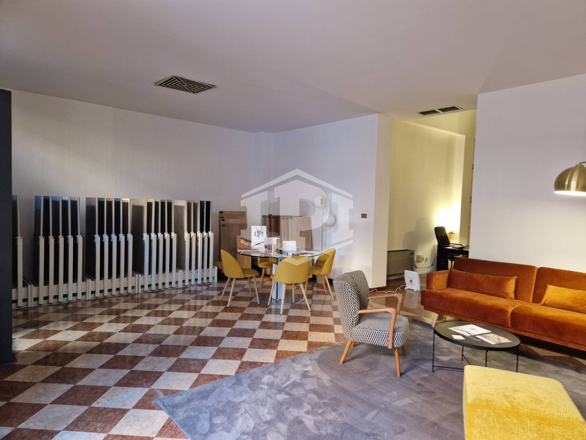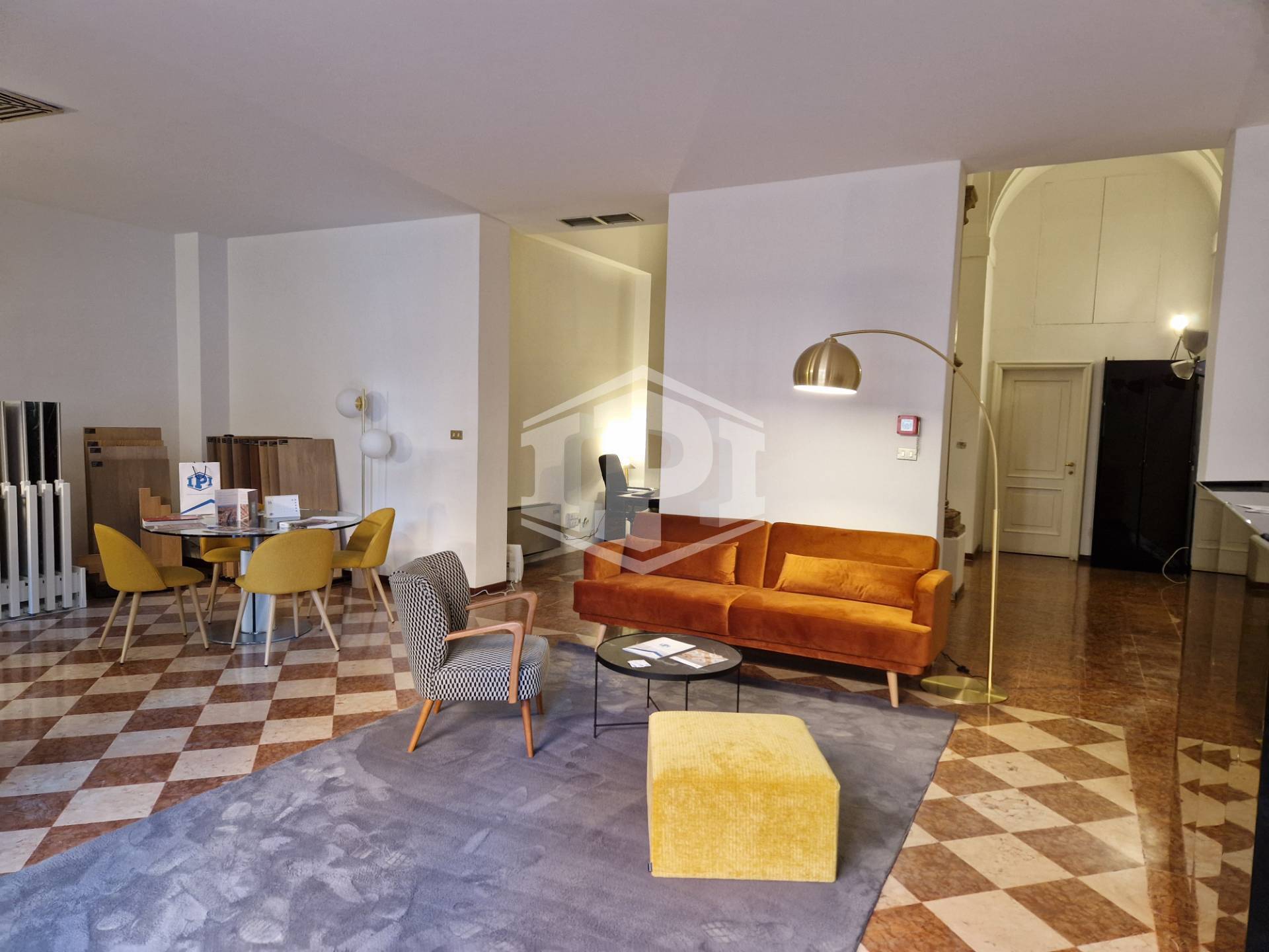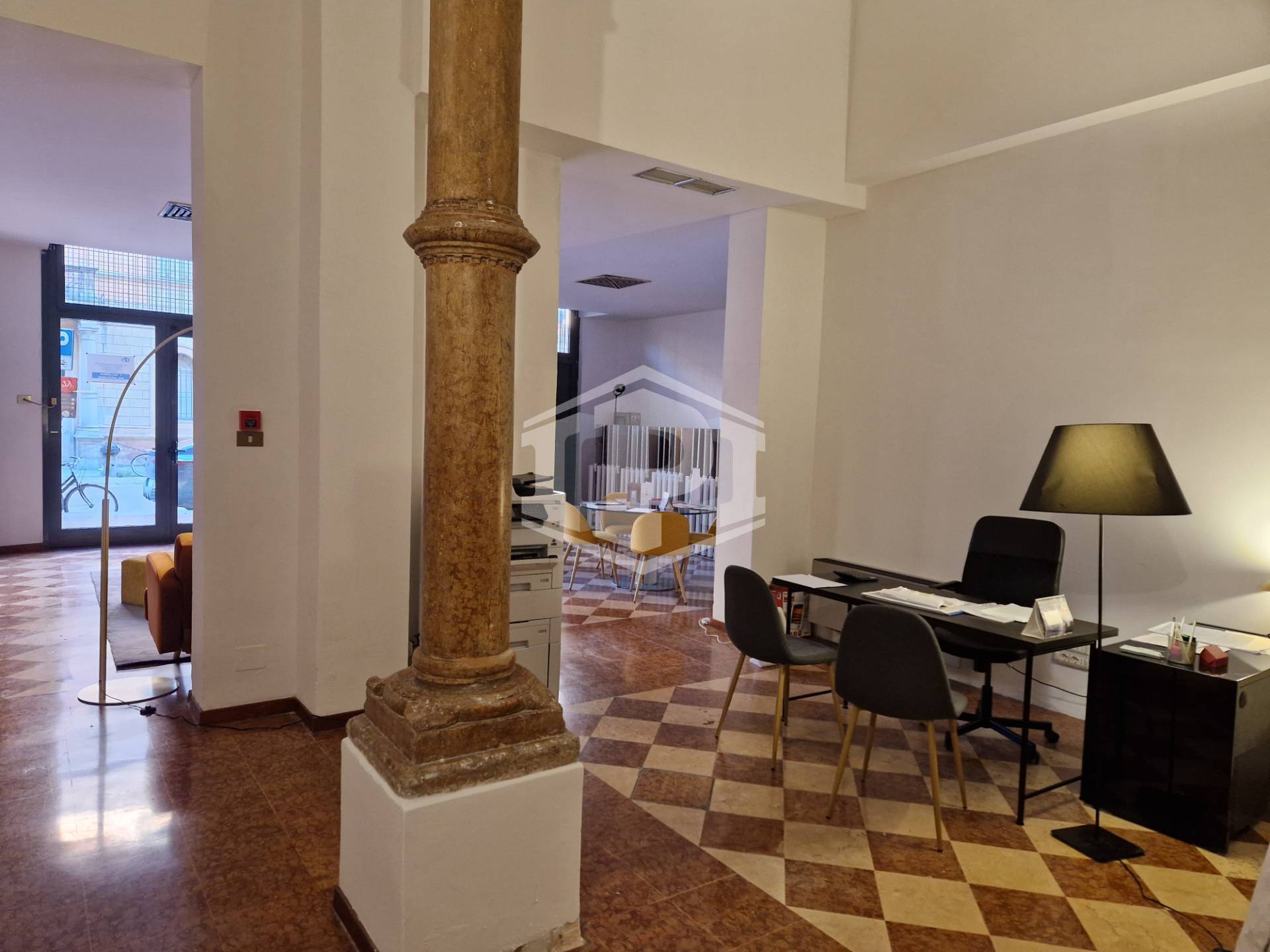 Centro storico - Strada Maggiore - Locale commerciale di mq 106 circa, con 2 vetrine sotto portico, costituito da un ampio ambiente open-space e una parte sul retro multifunzionale, ad esempio area esposizione con cabine prova, zona ufficio, oppure spazio deposito/magazzino/archivio, oltre a bagno e antibagno. Il locale fa parte di un edificio storico di pregio ed è adatto sia per uso commerciale-negozio che come ufficio, studio, show-room.