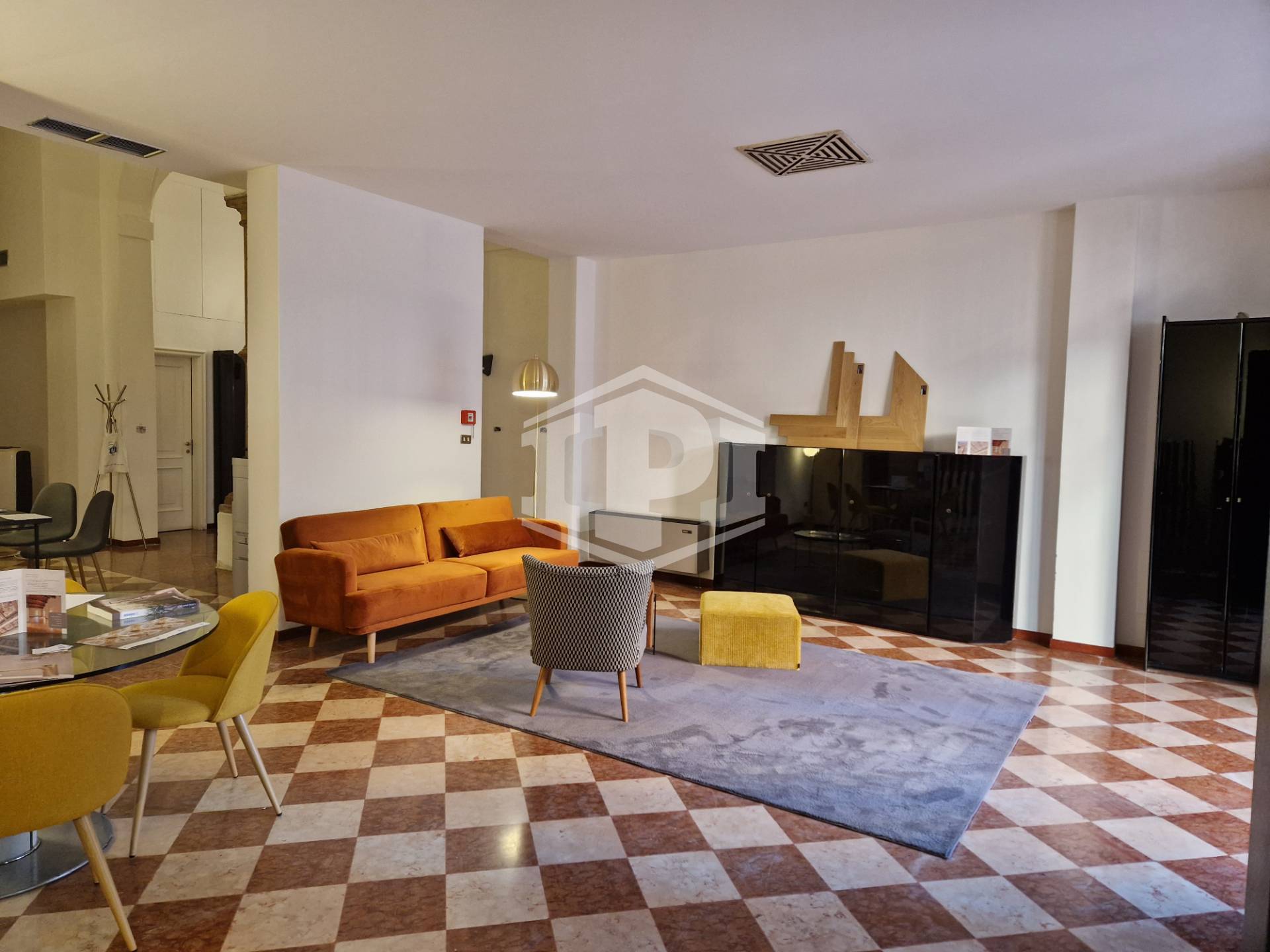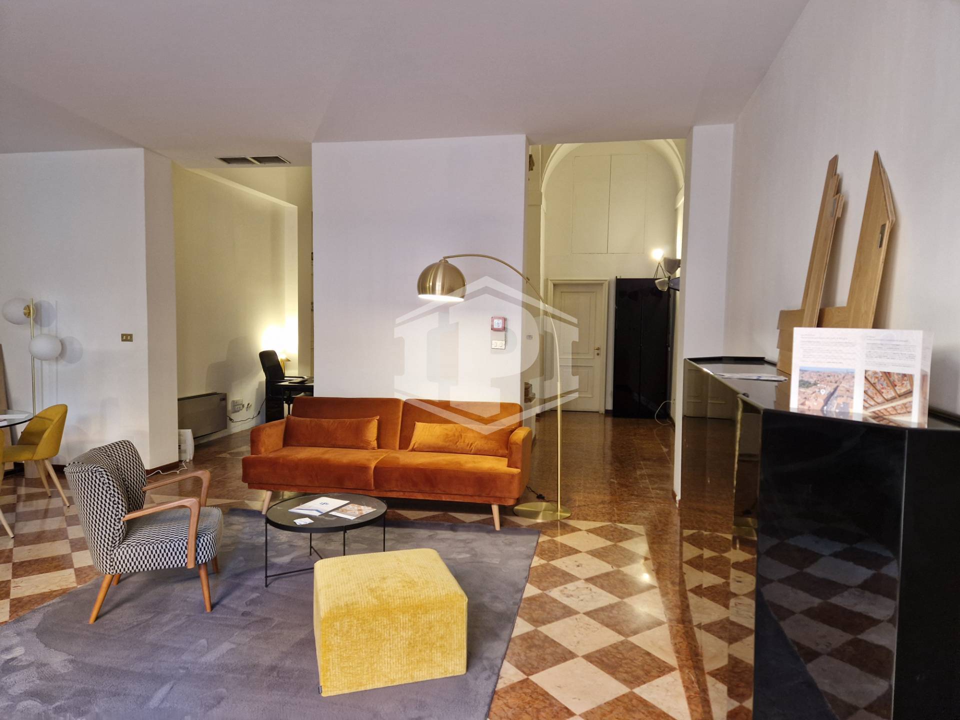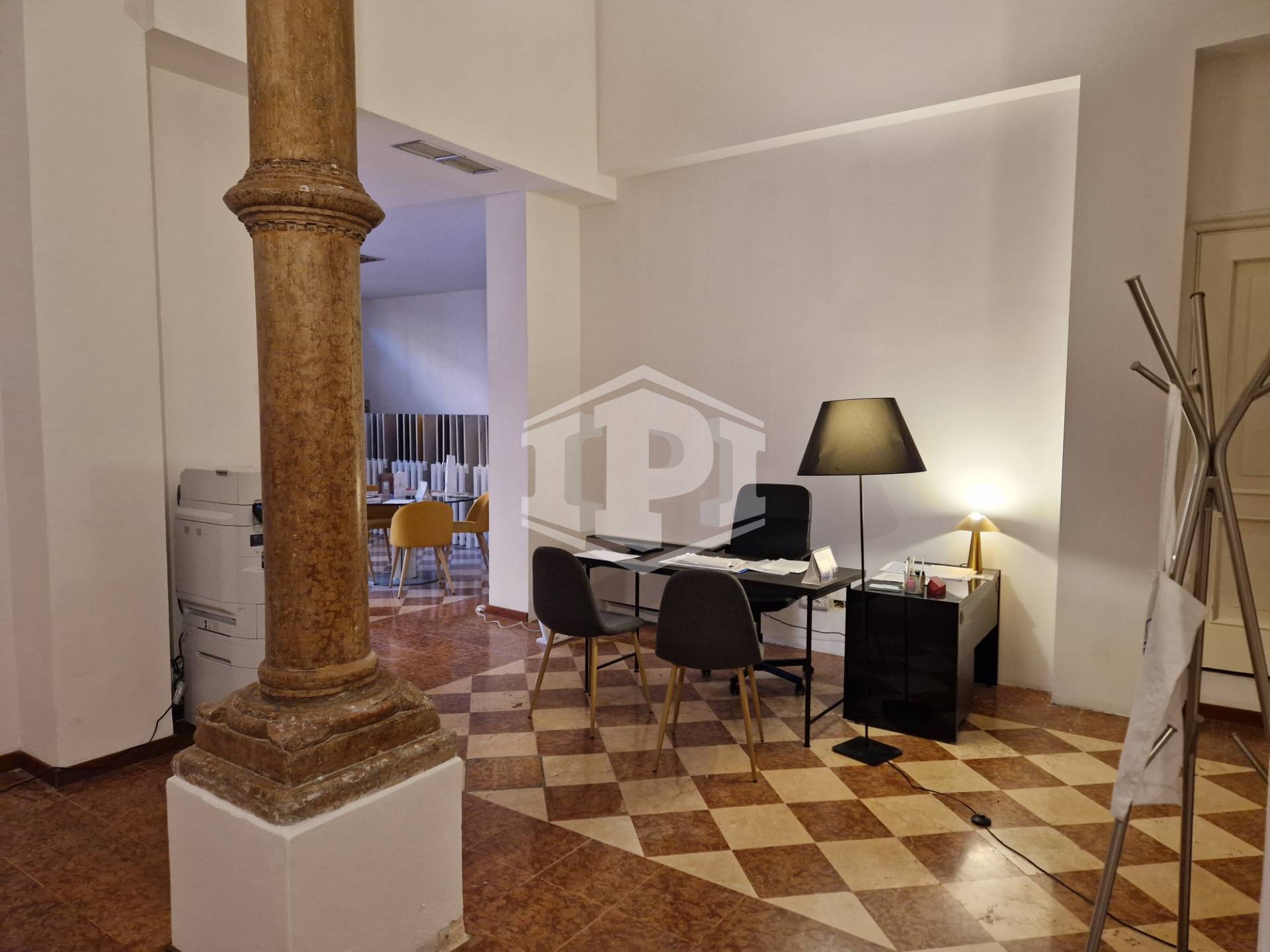 Centro storico - Strada Maggiore - Locale commerciale di mq 106 circa, con 2 vetrine sotto portico, costituito da un ampio ambiente open-space e una parte sul retro multifunzionale, ad esempio area esposizione con cabine prova, zona ufficio, oppure spazio deposito/magazzino/archivio, oltre a bagno e antibagno. Il locale fa parte di un edificio storico di pregio ed è adatto sia per uso commerciale-negozio che come ufficio, studio, show-room.