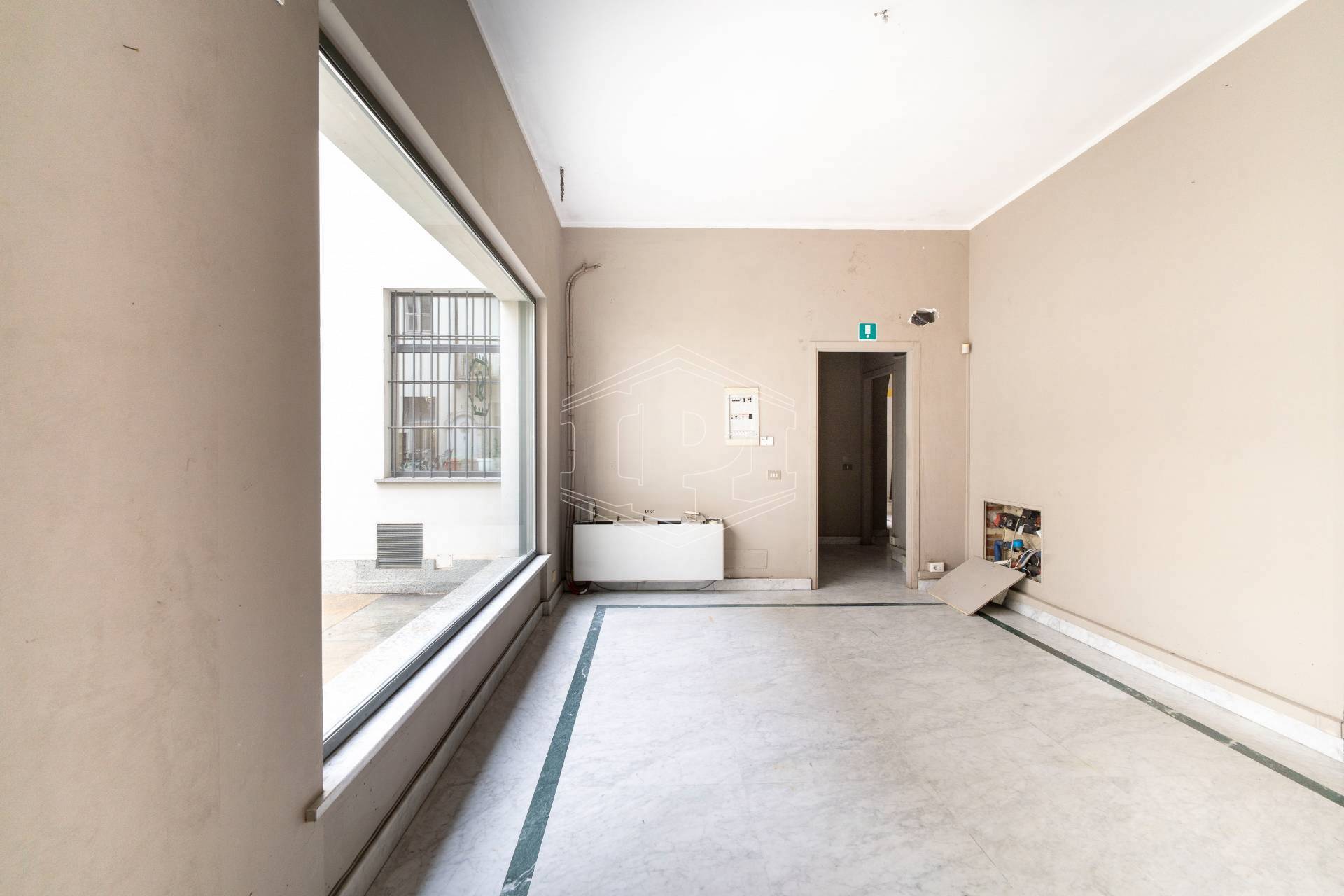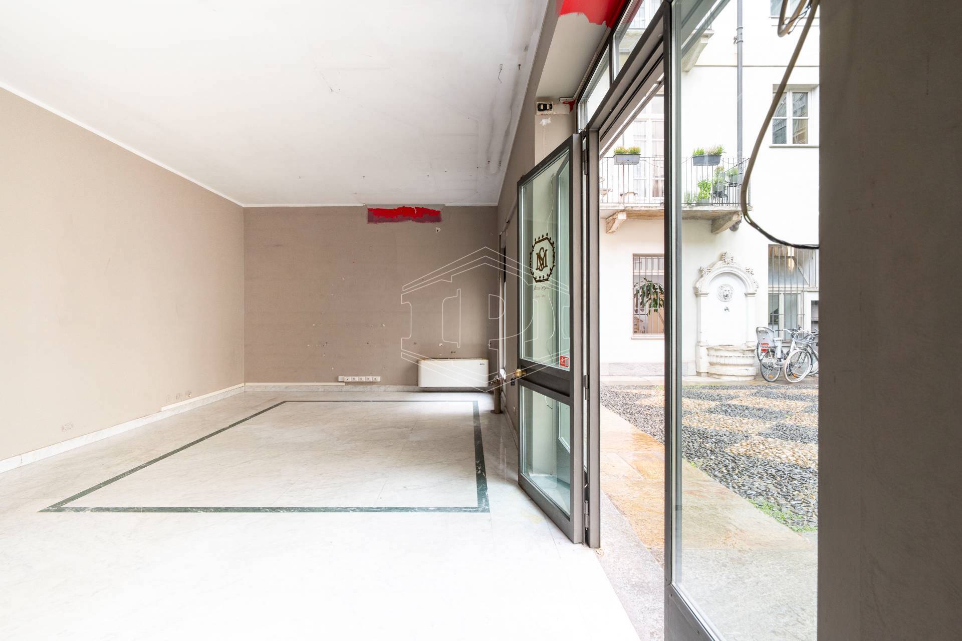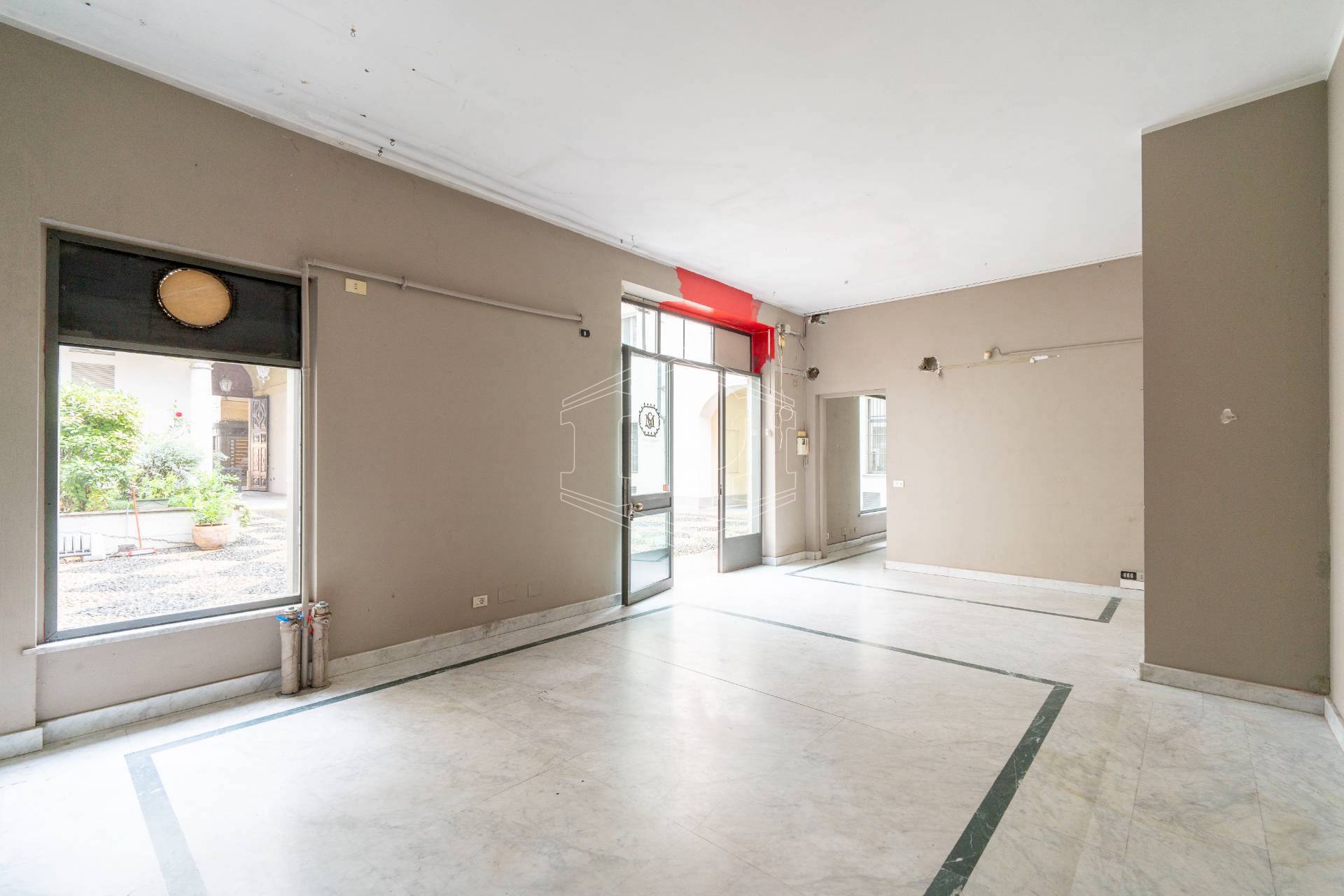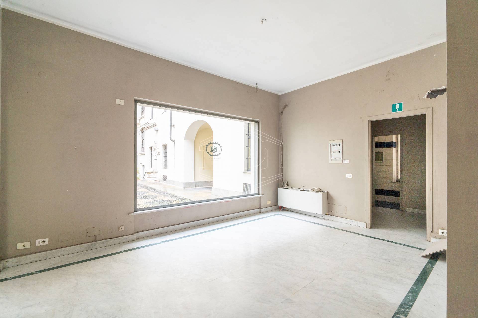 Lo spazio è ubicato nella corte di un elegante stabile d'epoca, ha una superficie complessiva di 107 metri quadri ed è dotato di tre vetrine con affaccio su Piazza Castello.