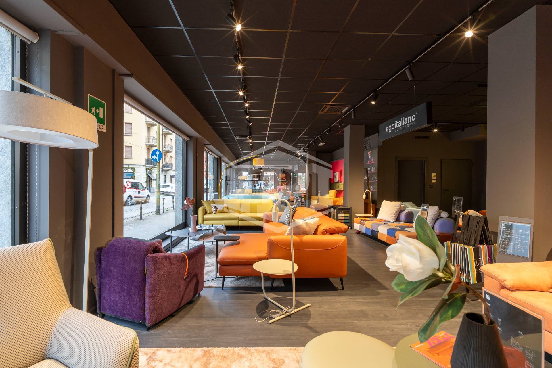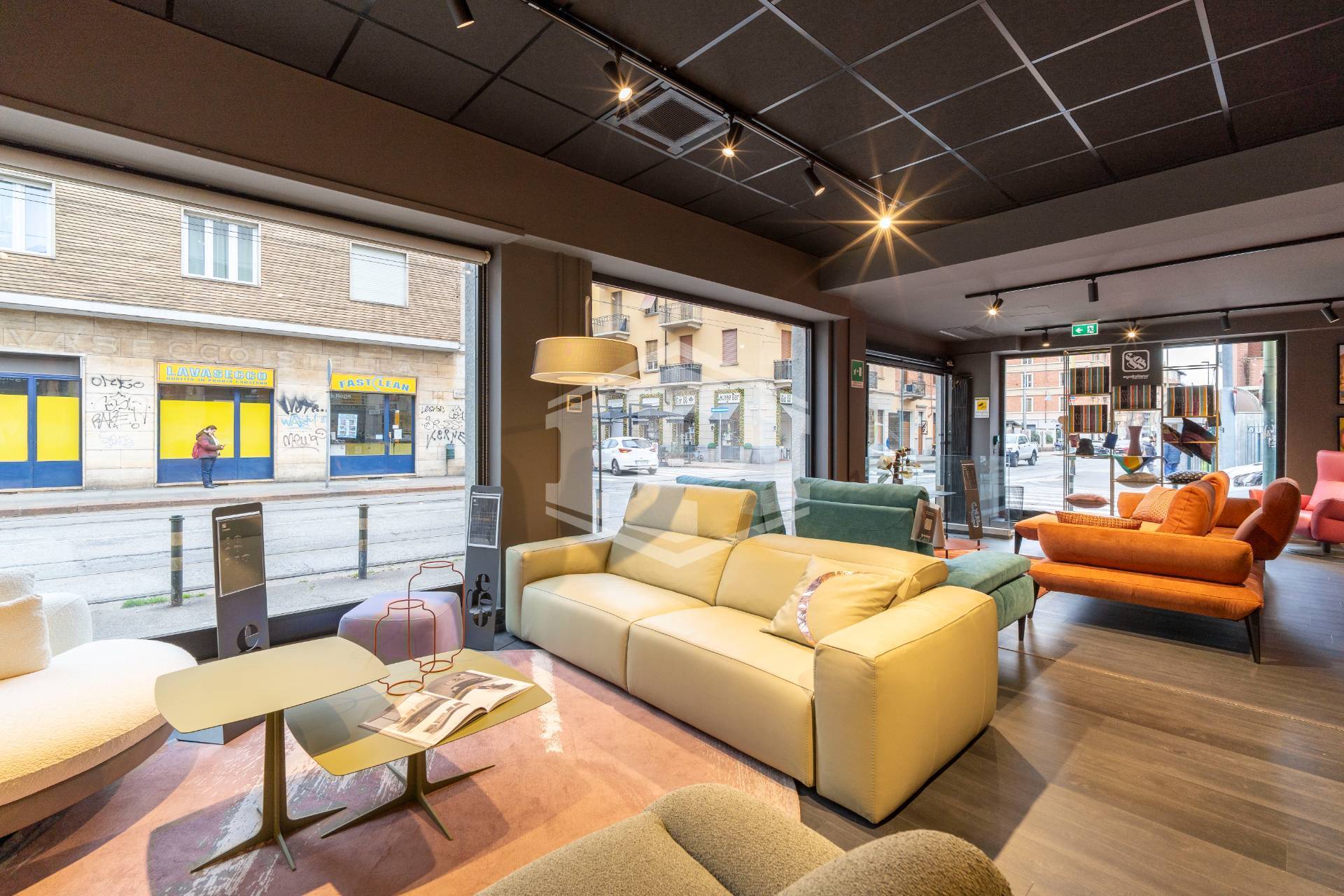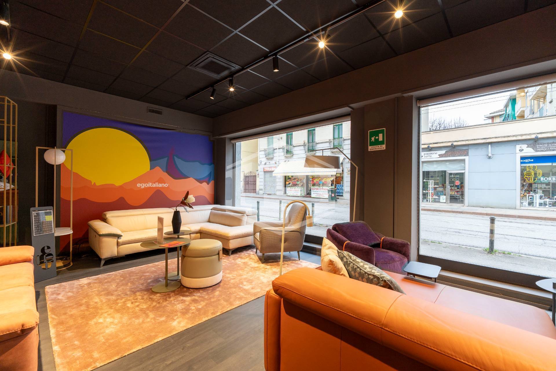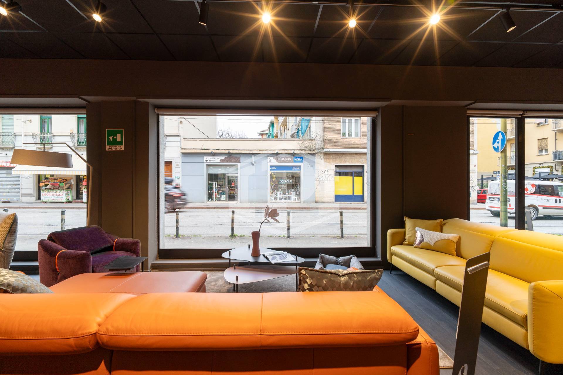 Il fronte, sviluppato su Via Nicola Fabrizi , è dotato di sei vetrine mentre le restanti due sono posizionate sul lato di Via Borgomanero.
