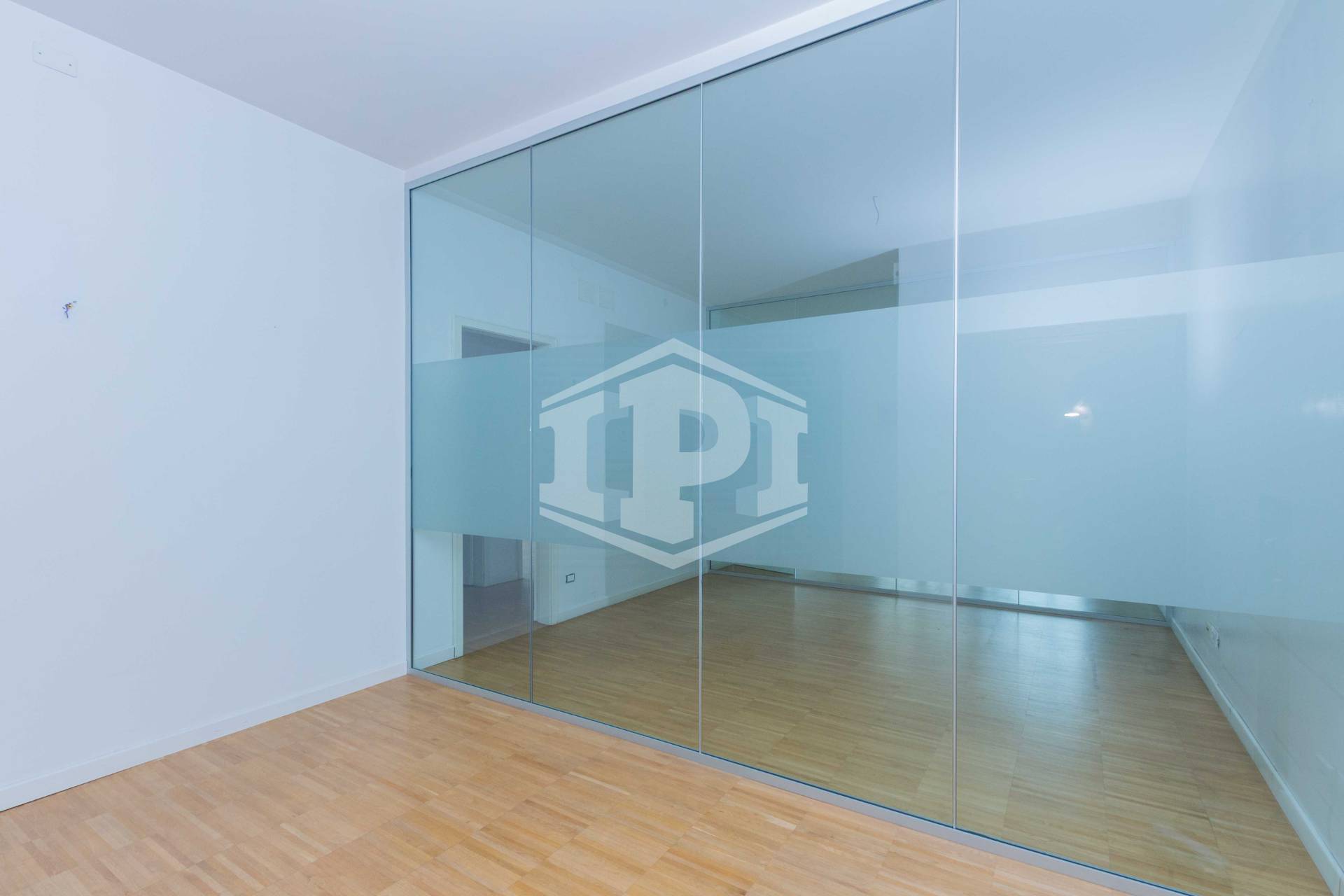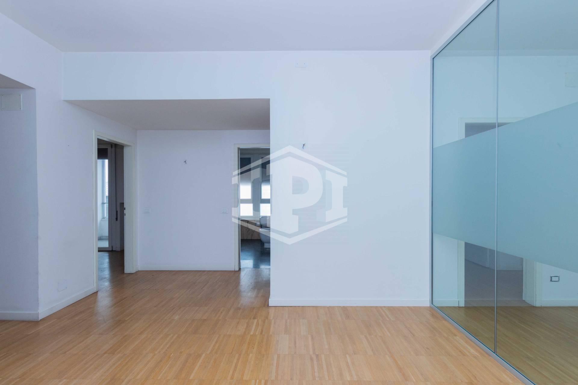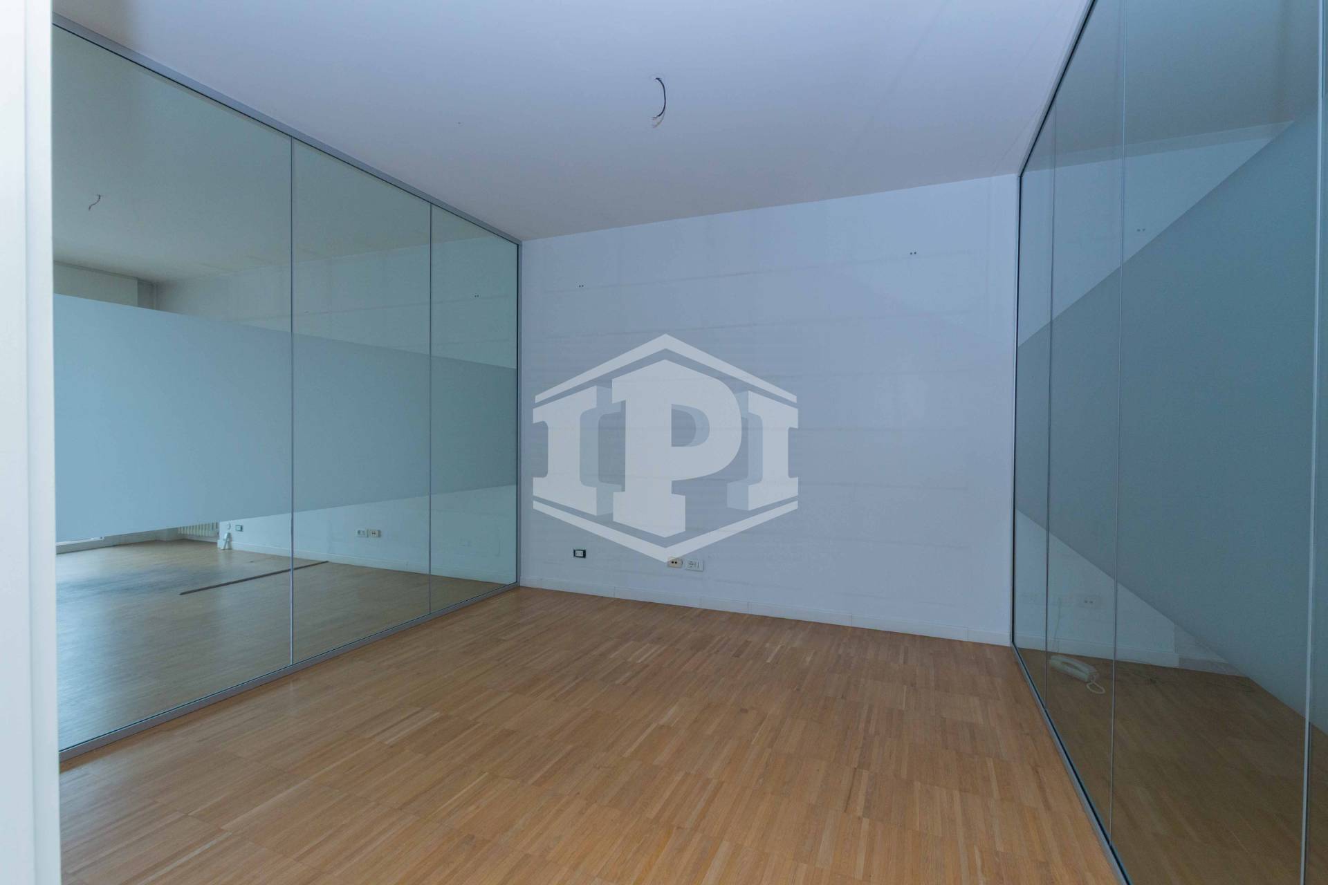 L'unità si compone da ingresso, sala riunioni grande e luminosa con affaccio su Largo Europa, quattro uffici, un vano archivio e due bagni.
