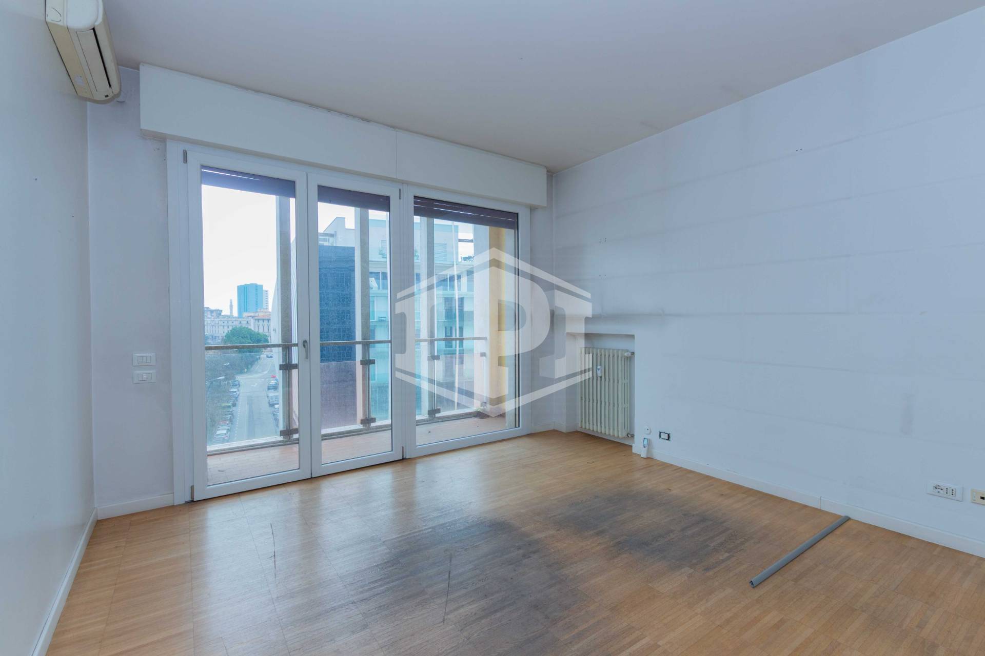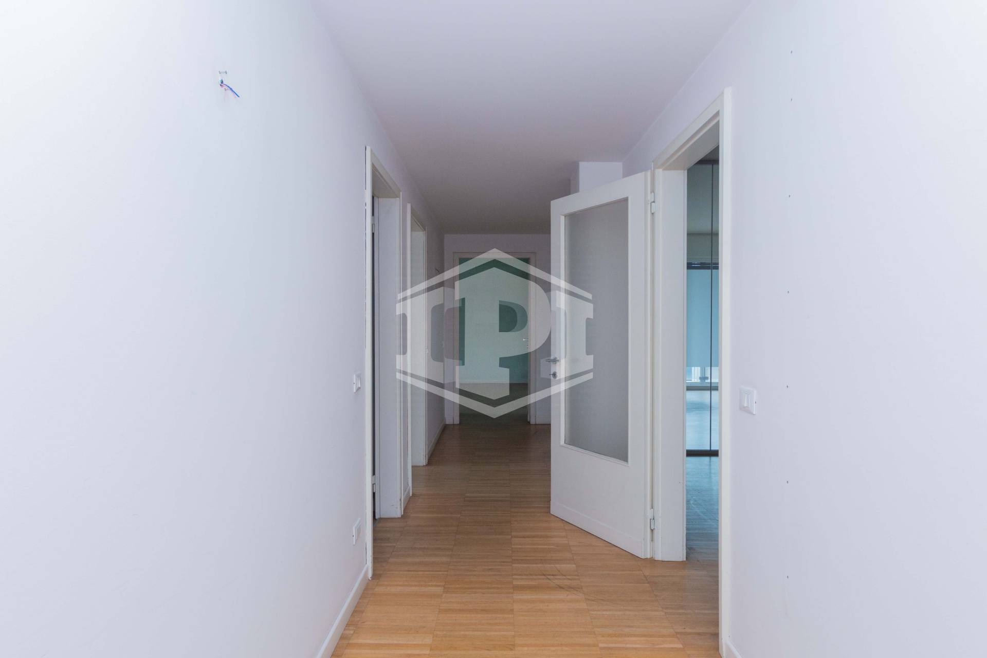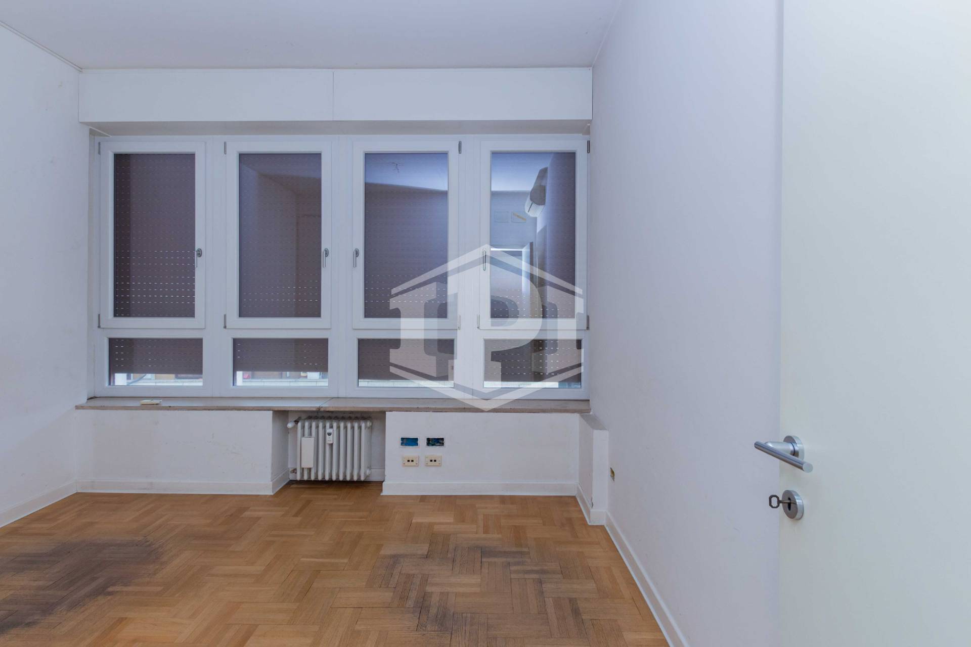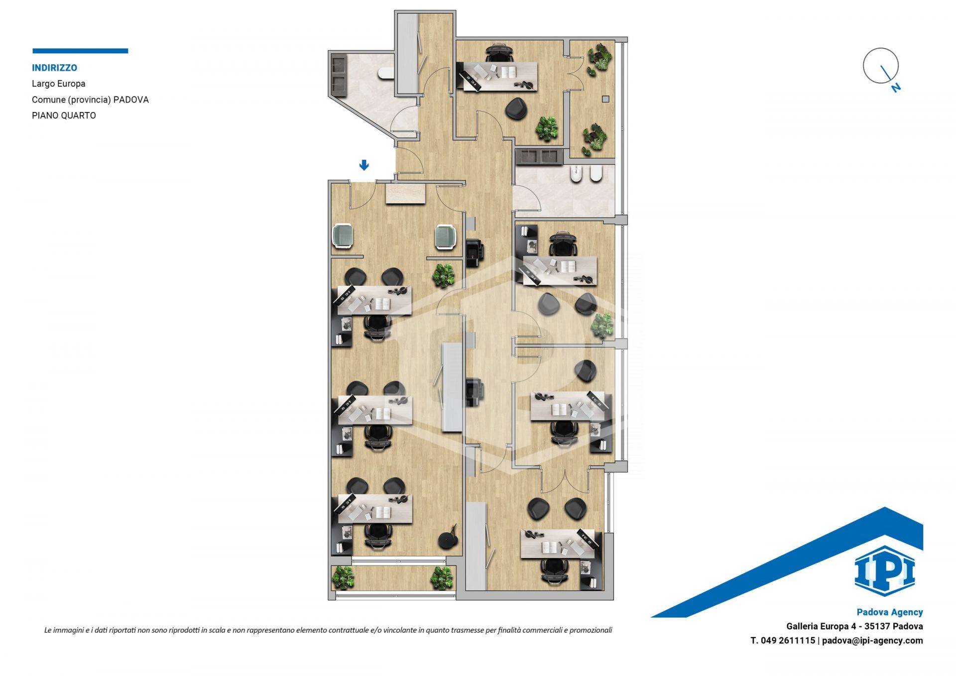 L'unità si compone da ingresso, sala riunioni grande e luminosa con affaccio su Largo Europa, quattro uffici, un vano archivio e due bagni.