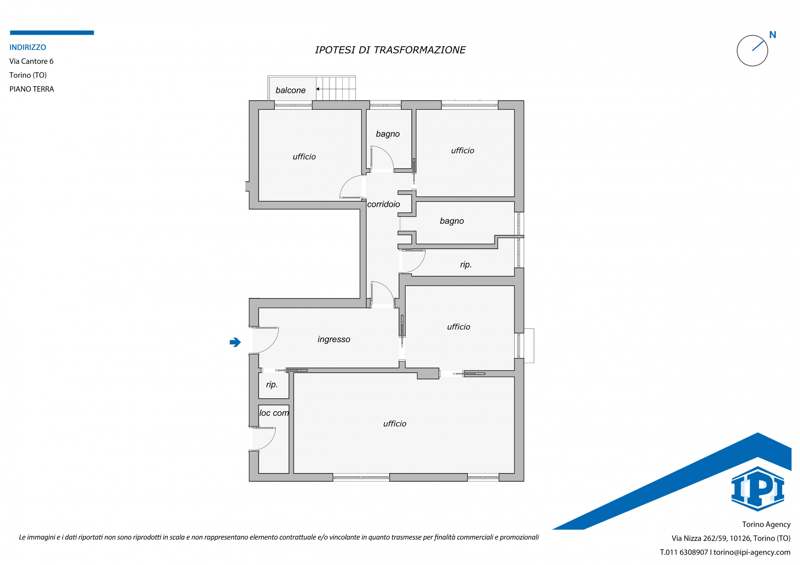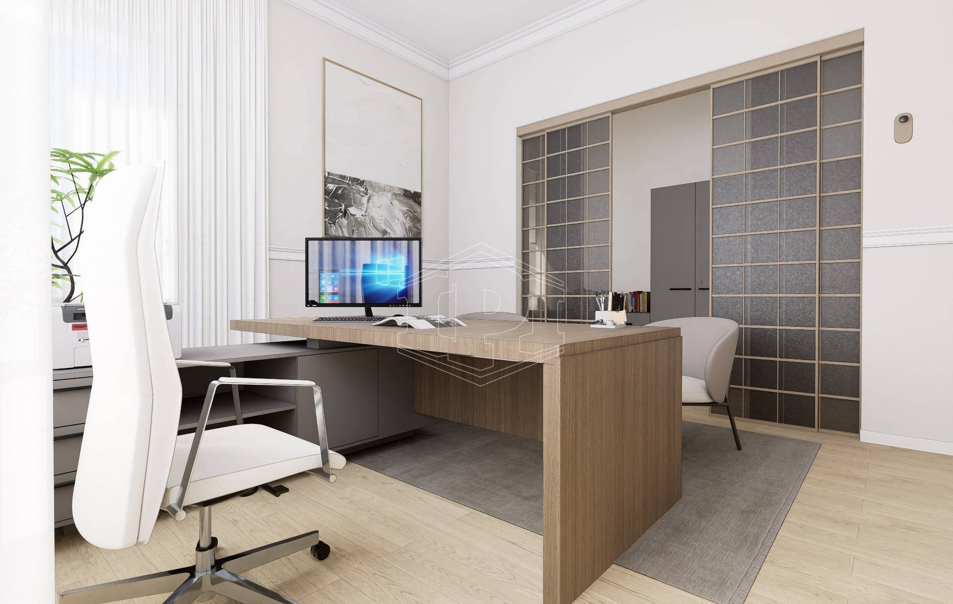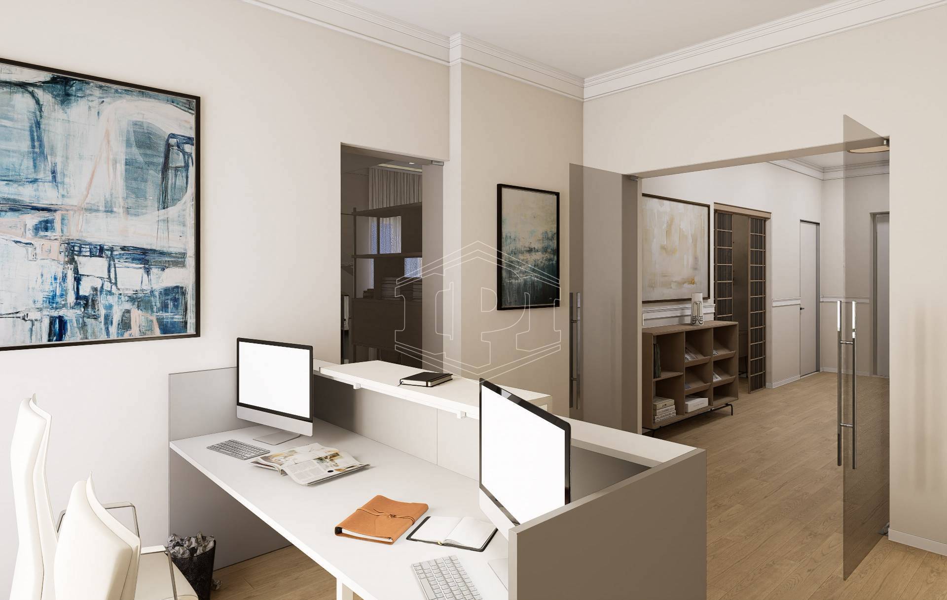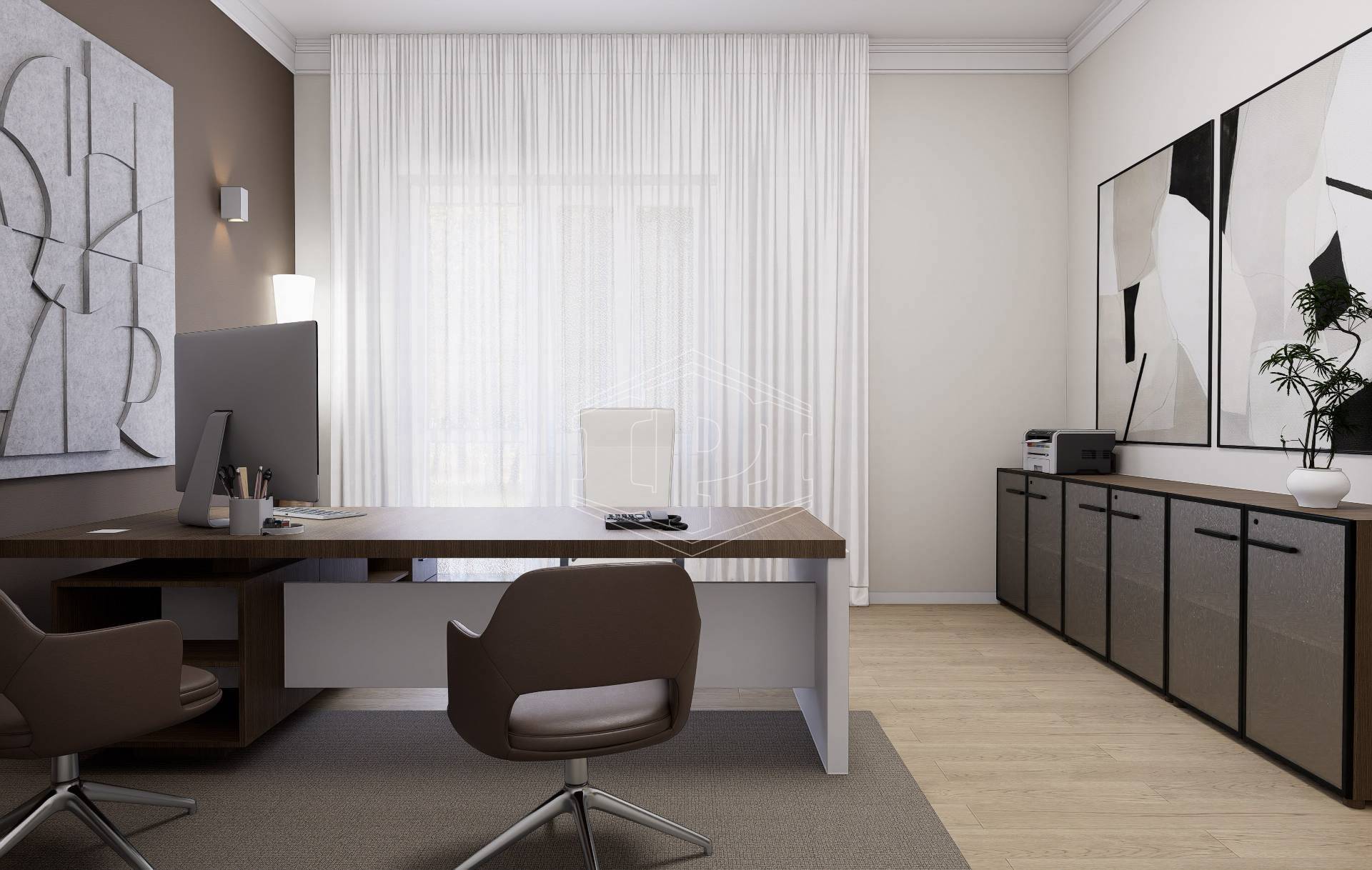 Ufficio di 219 mq, attualmente adibito ad abitazione con possibilità di cambio di destinazione d'uso, composto da: ingresso/reception, salone open space, tre vani, due bagni, archivio, ripostiglio. Completano la proprietà il giardino condominiale a cui si accede dal balcone e il box auto al piano interrato acquistabile a parte a € 40.000.