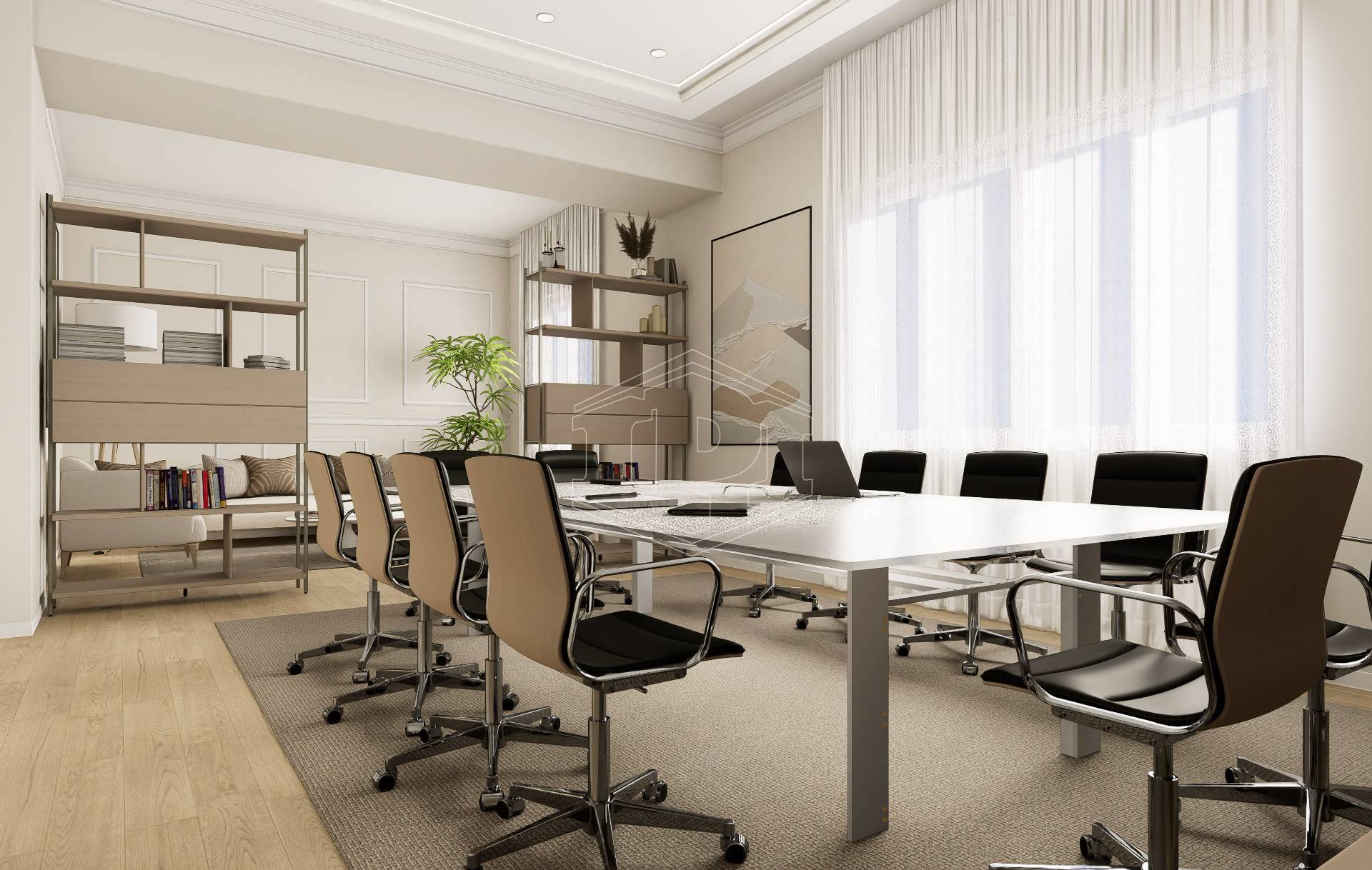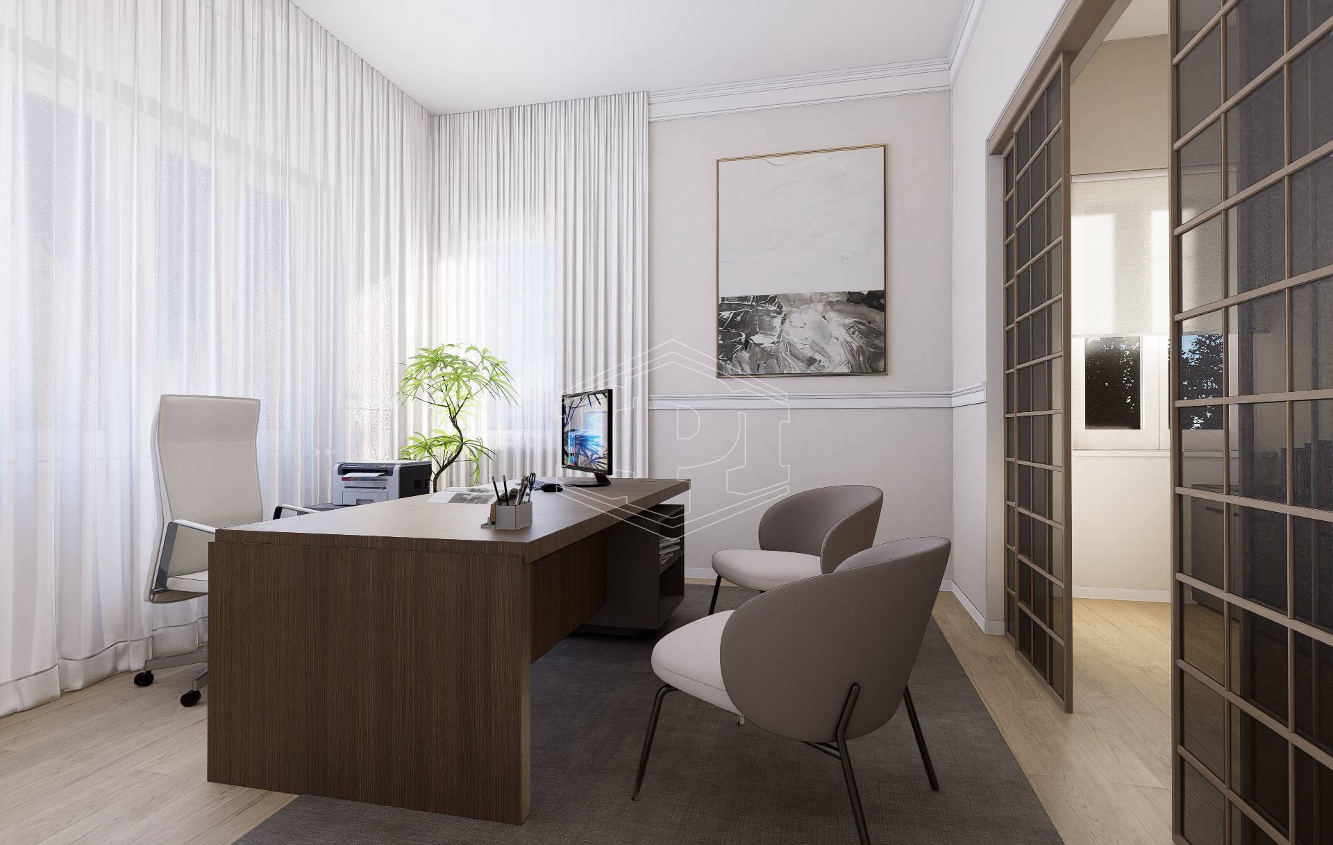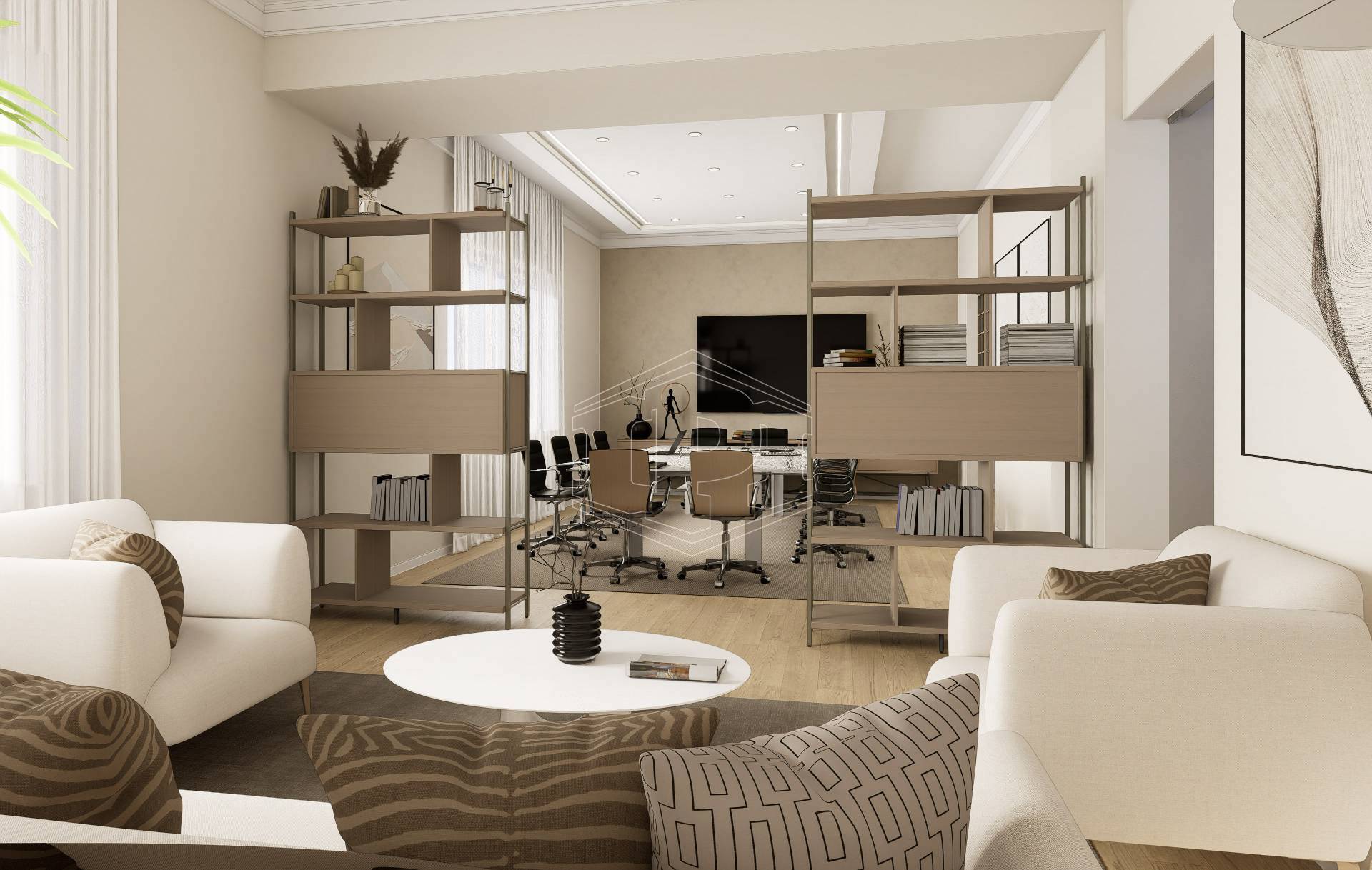 Ufficio di 219 mq, attualmente adibito ad abitazione con possibilità di cambio di destinazione d'uso, composto da: ingresso/reception, salone open space, tre vani, due bagni, archivio, ripostiglio. Completano la proprietà il giardino condominiale a cui si accede dal balcone e il box auto al piano interrato acquistabile a parte a € 40.000.