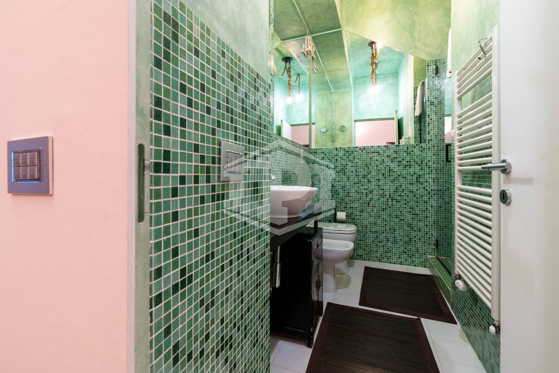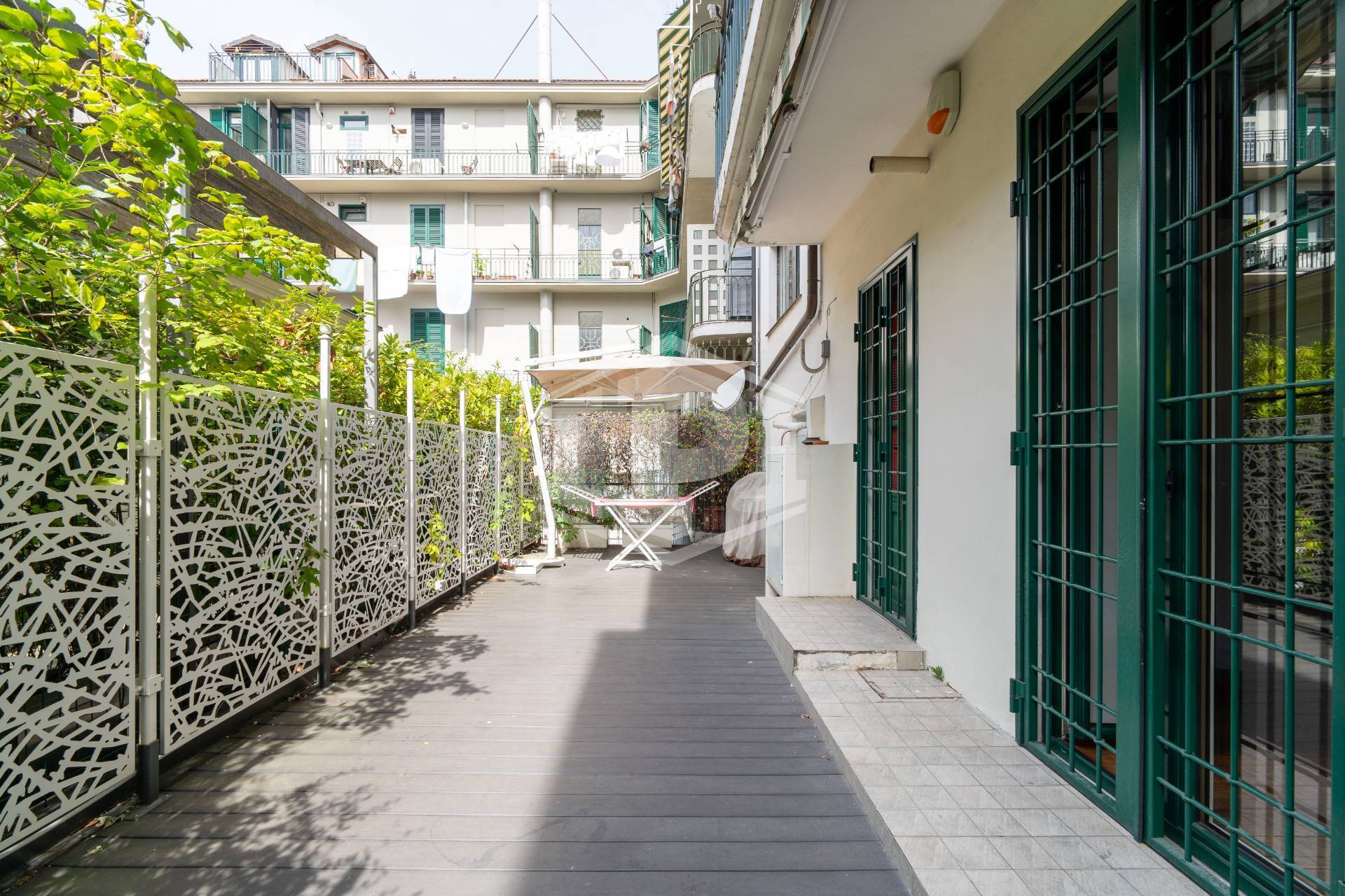 I pavimenti sono in parquet su quasi tutta la superficie dell'appartamento, ad eccezione di un vano e dei due bagni dove è presente una pavimentazione in gres e rivestimenti in mosaico. I serramenti sul lato interno cortile sono in alluminio verniciato con vetrocamera e dotati di grate di sicurezza completamente apribili; gli infissi su lato strada in sono in legno con vetro doppio. L'oscuramento è garantito da tapparelle sul lato terrazzo e da avvolgibili sul lato strada. Porte interne a filo muro con finitura ad intonaco. È presente l'impianto di condizionamento aria con split nel vano a giorno ed in uno dei due vani lato strada. Il riscaldamento è autonomo con caldaia a condensazione. Le spese condominiali sono di circa € 150,00 al mese.