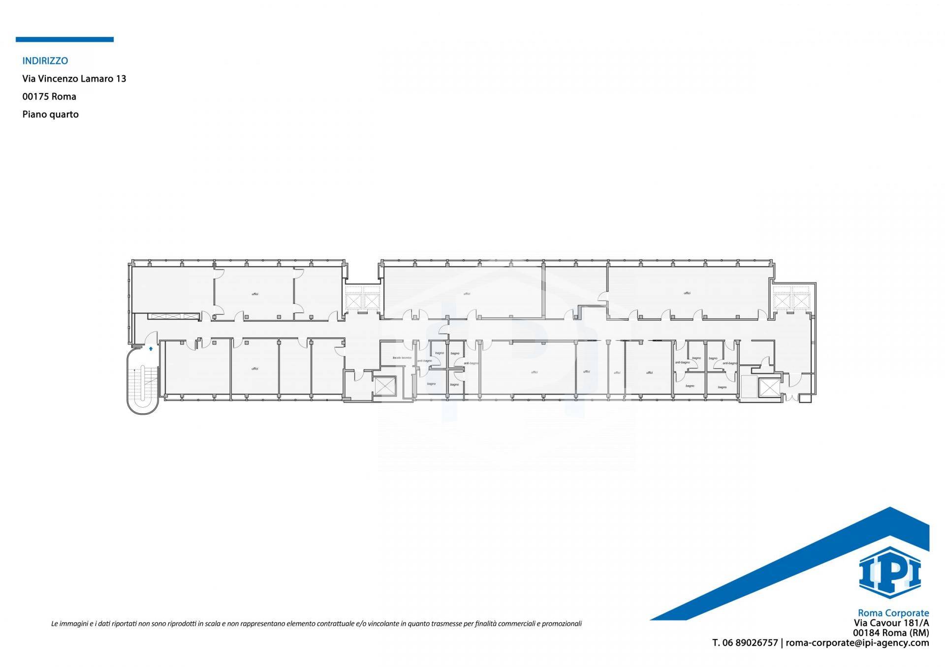 CINECITTA' - e più precisamente in Via Lamaro, Ipi propone in affitto uffici di 640mq, posti al 4° piano di un complesso costituito da due immobili (A e B), collegati tra loro, realizzati su 6 piani fuori terra a destinazione uffici e 2 piani interrati a destinazione autorimessa ed archivi. La struttura portante è in cemento armato, a facciata continua, interamente vetrata, partizioni interne mobili per la maggior parte del complesso edilizio. L'ampia area esterna è destinata a parcheggi pubblici ed aree verdi.