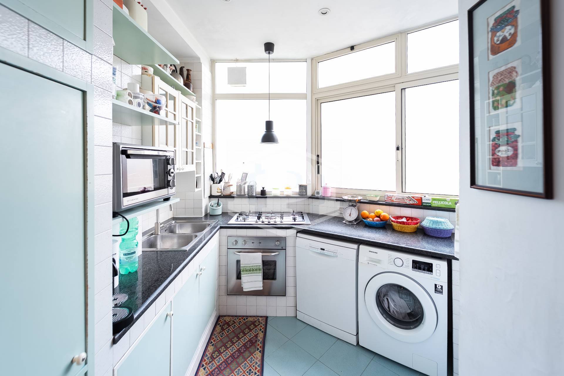 L'immobile si trova al quinto piano di un fabbricato costruito negli anni '60 e dotato di servizio di portierato ed ascensore. L'appartamento si estende su una superficie totale di 160 metri quadrati, di cui 140 sono calpestabili. La distribuzione degli spazi è molto ben organizzata e prevede un ampio ingresso che conduce alla zona giorno, composta da un doppio salone con soggiorno e una cucina abitabile.