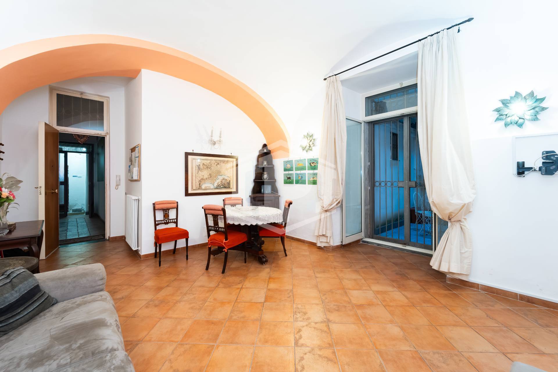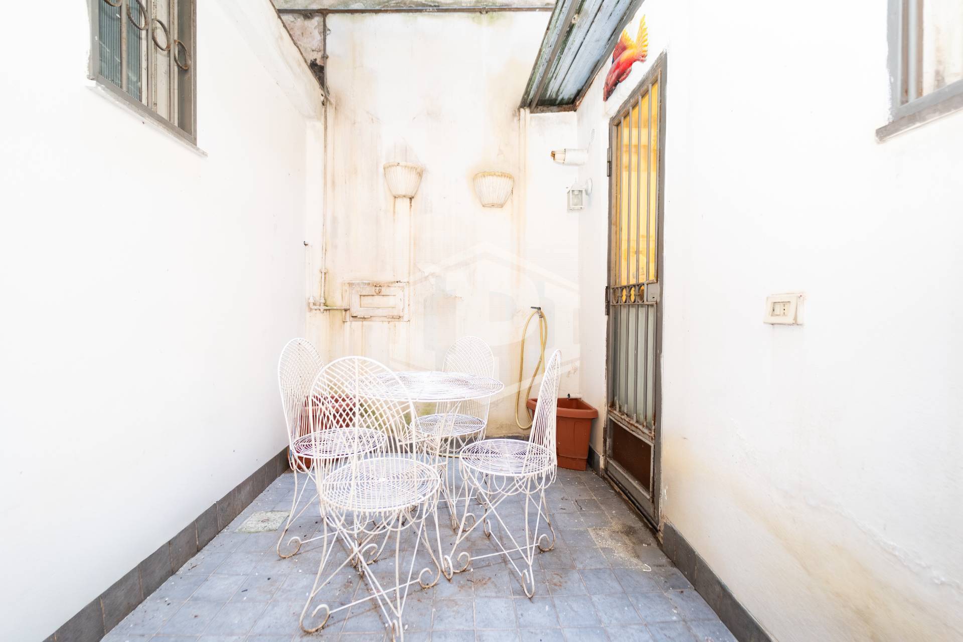 L'ingresso dell'immobile avviene tramite un pratico e riservato corridoio piastrellato con mattonelle d'epoca, protetto da cancellata e condiviso solo in parte con l'unità adiacente: un dettaglio che conferisce maggiore privacy rispetto al tradizionale passaggio dalla corte principale.