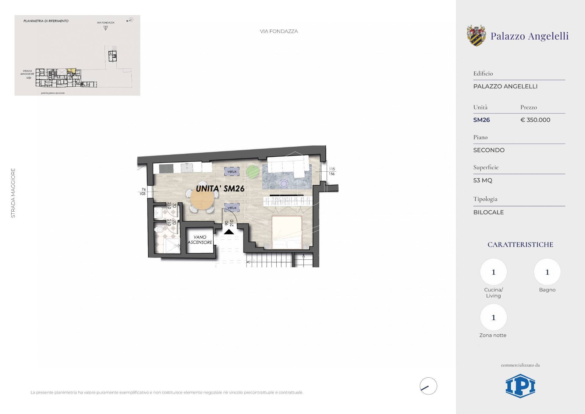 Centro Storico - Strada Maggiore - In stabile antico e di pregio, Palazzo Angelelli, Bilocale al secondo piano. Composto da ingresso su ampio living con zona cucina-pranzo e sala, zona notte separata, bagno e antibagno. L'abitazione, di pregio, è caratterizzata dalla presenza di una parte di tetto in legno a vista con due velux che donano all'ambiente una naturale illuminazione. Il doppio affaccio su corti interne conferisce assoluta tranquillità.