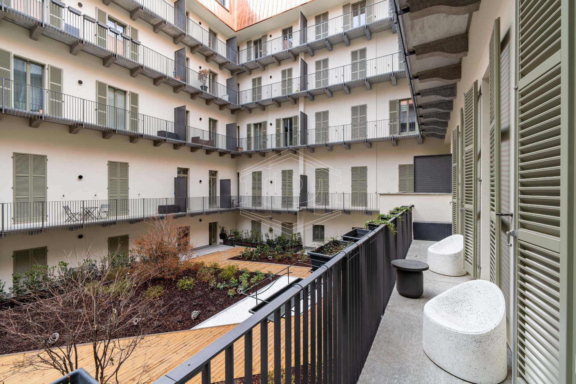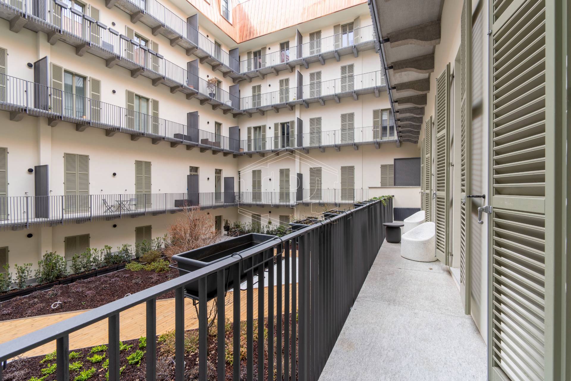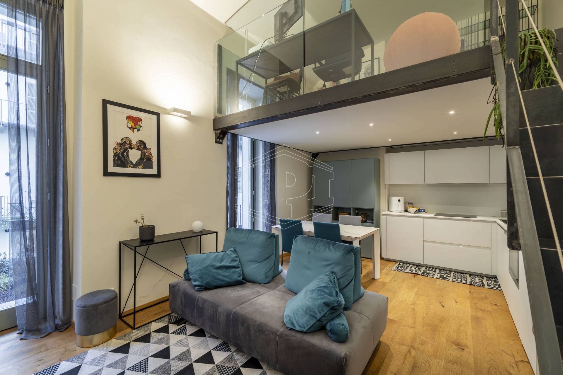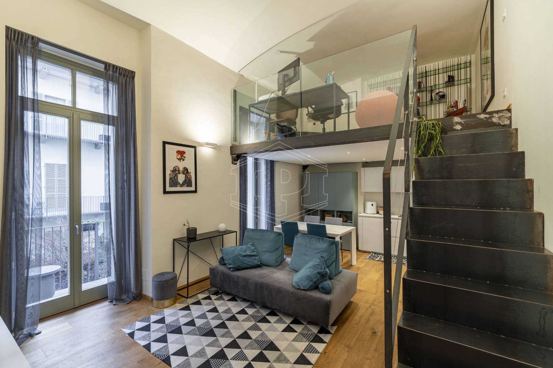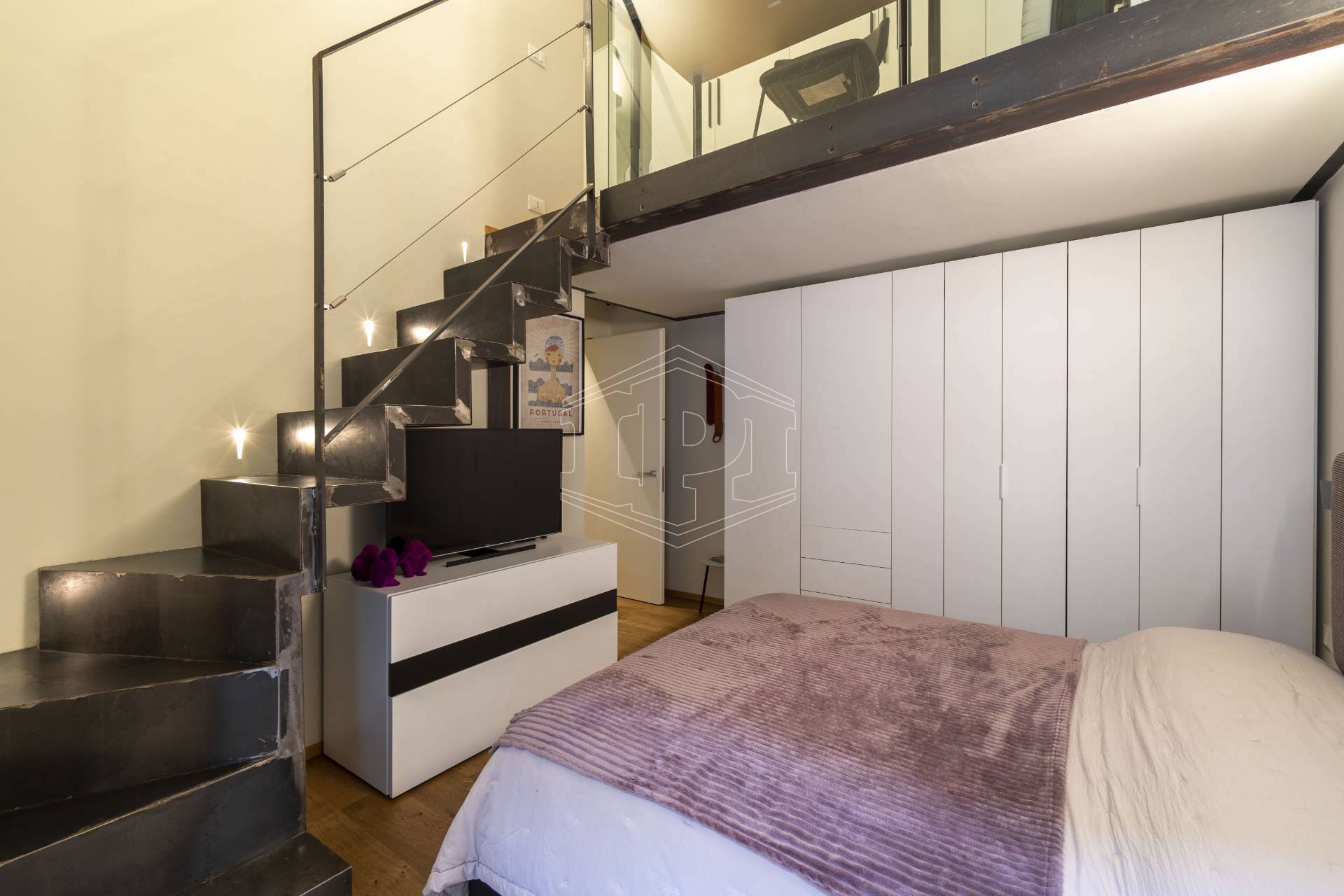 Appartamento completamente arredato di mq 83 composto da: ingresso su soggiorno con cucina collegato a un piano soppalco con zona studio, disimpegno, bagno, una camera da letto con soppalco ad uso cabina armadio, ampio balcone con affaccio su giardino interno.
