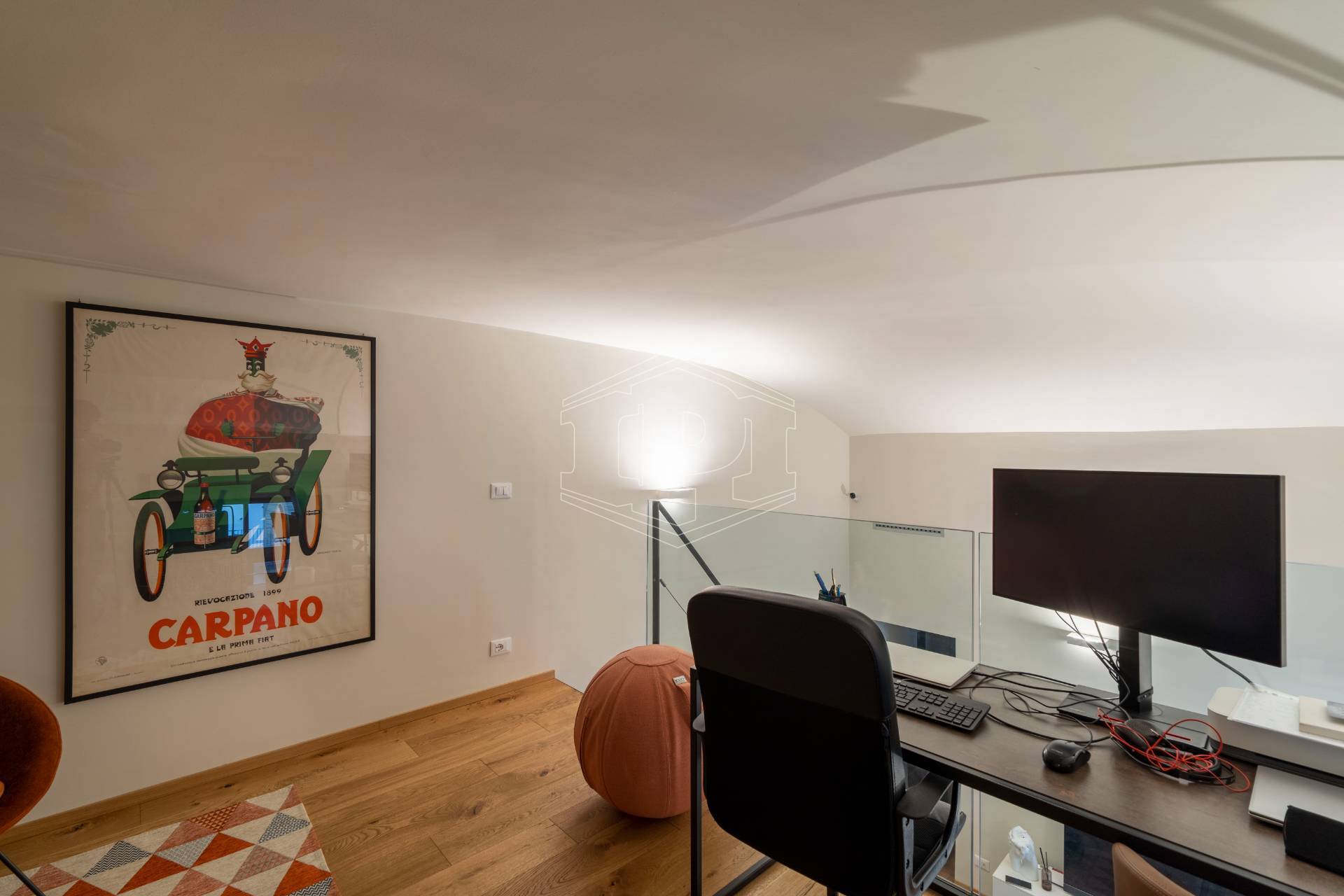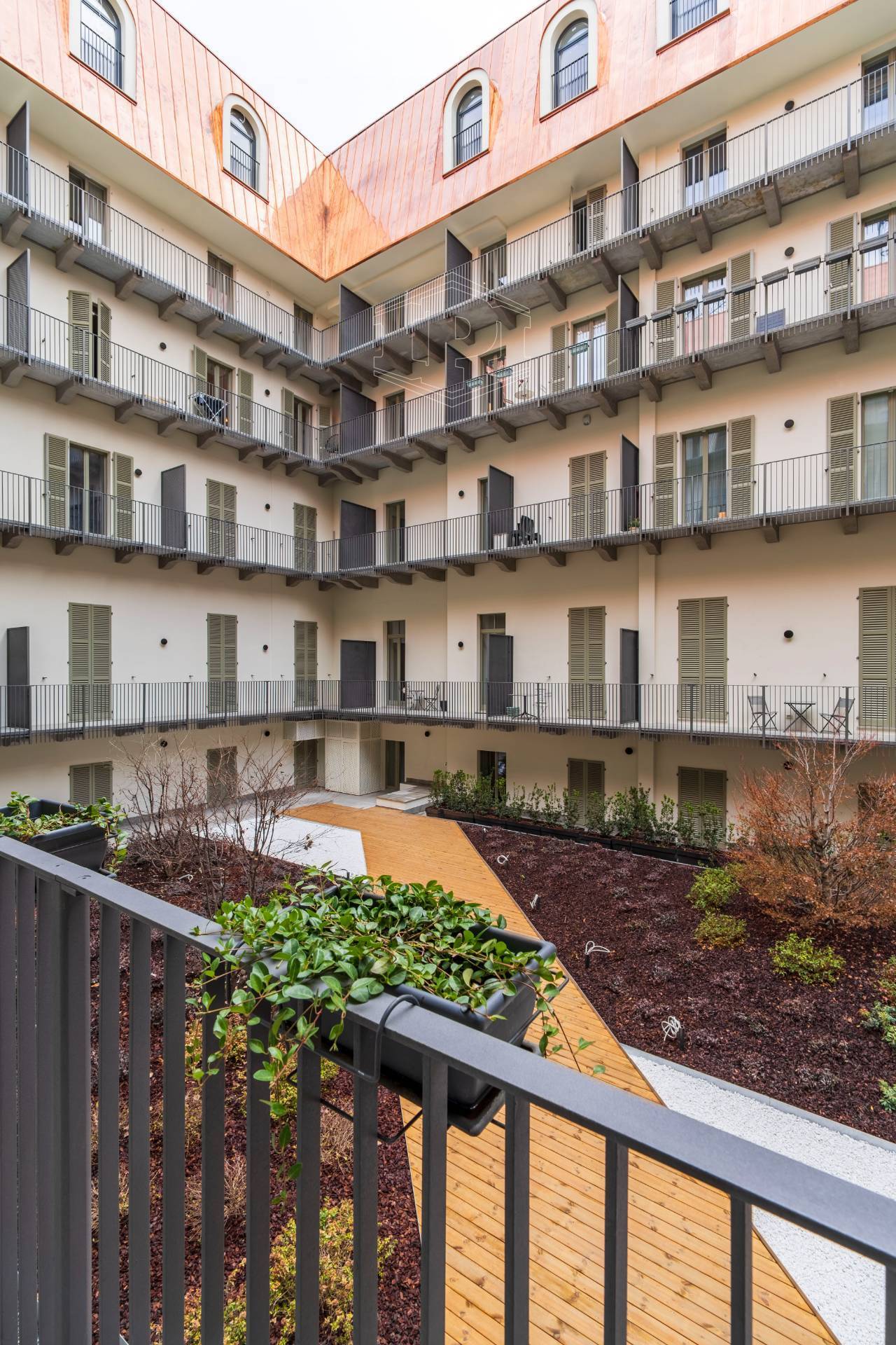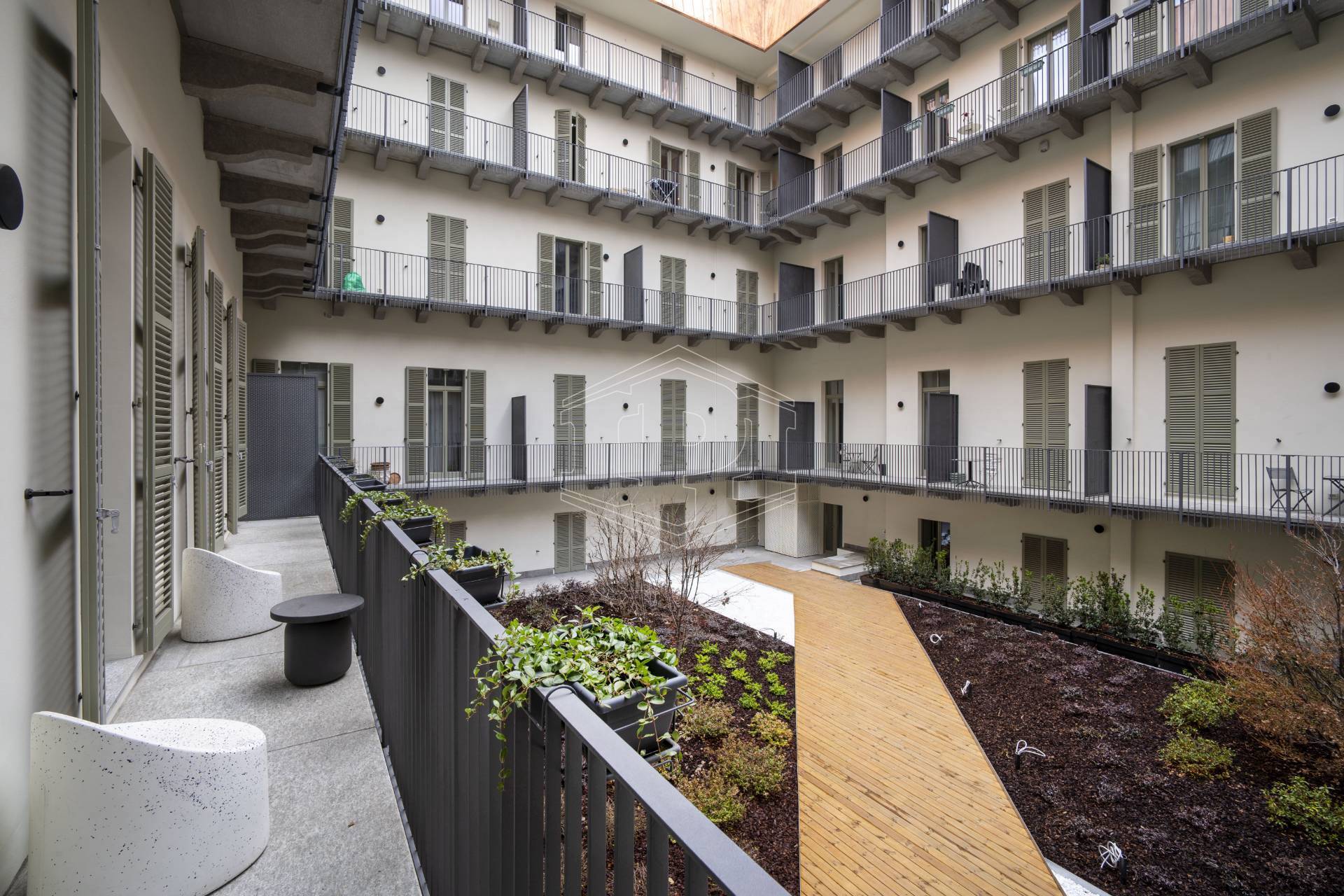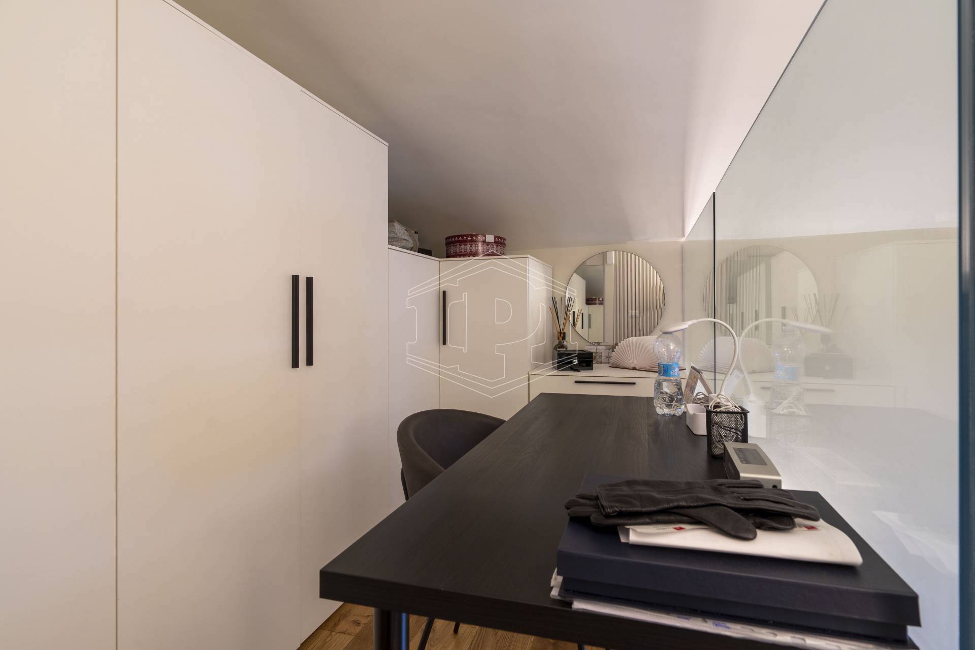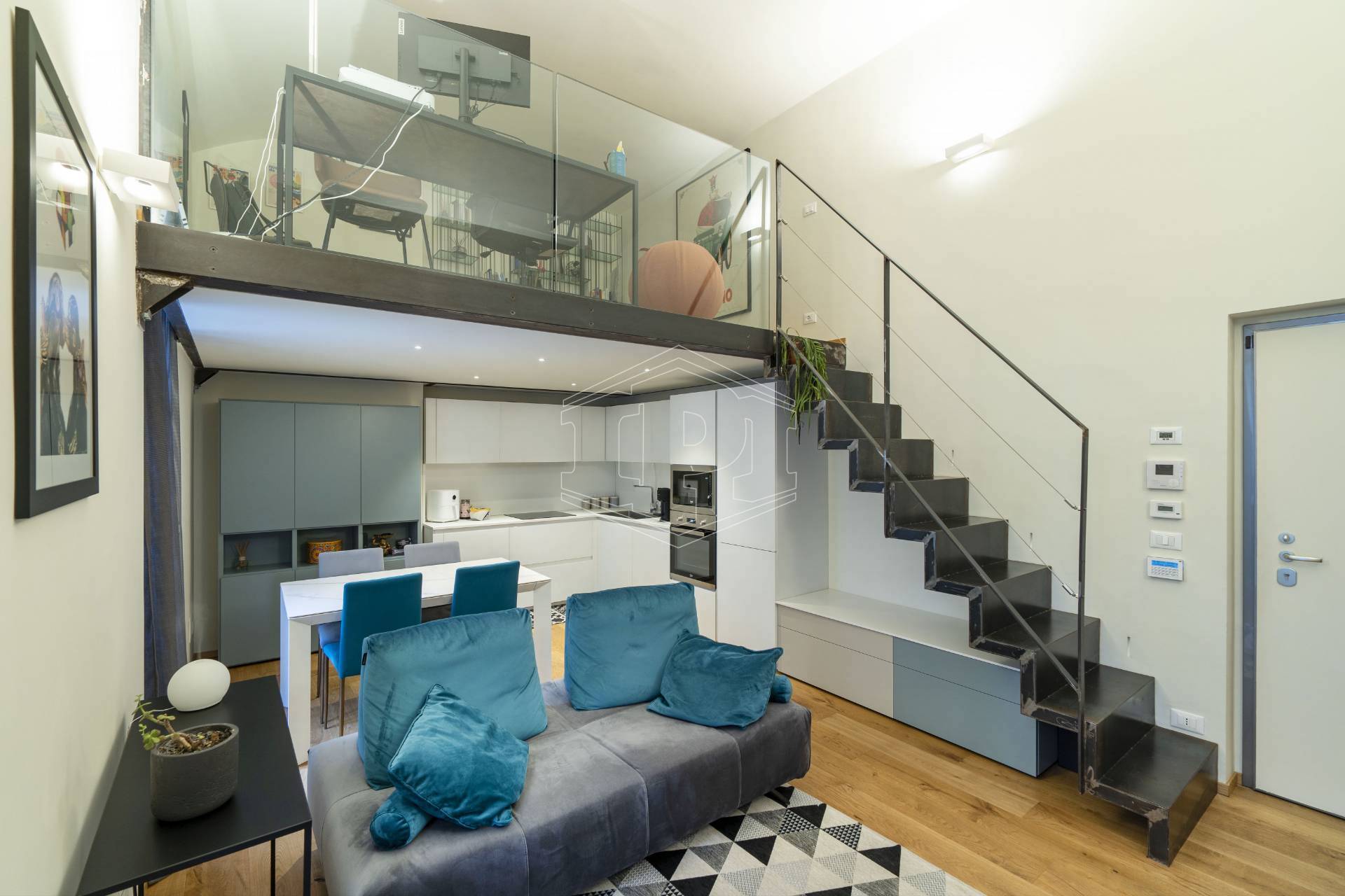 Appartamento completamente arredato di mq 83 composto da: ingresso su soggiorno con cucina collegato a un piano soppalco con zona studio, disimpegno, bagno, una camera da letto con soppalco ad uso cabina armadio, ampio balcone con affaccio su giardino interno.