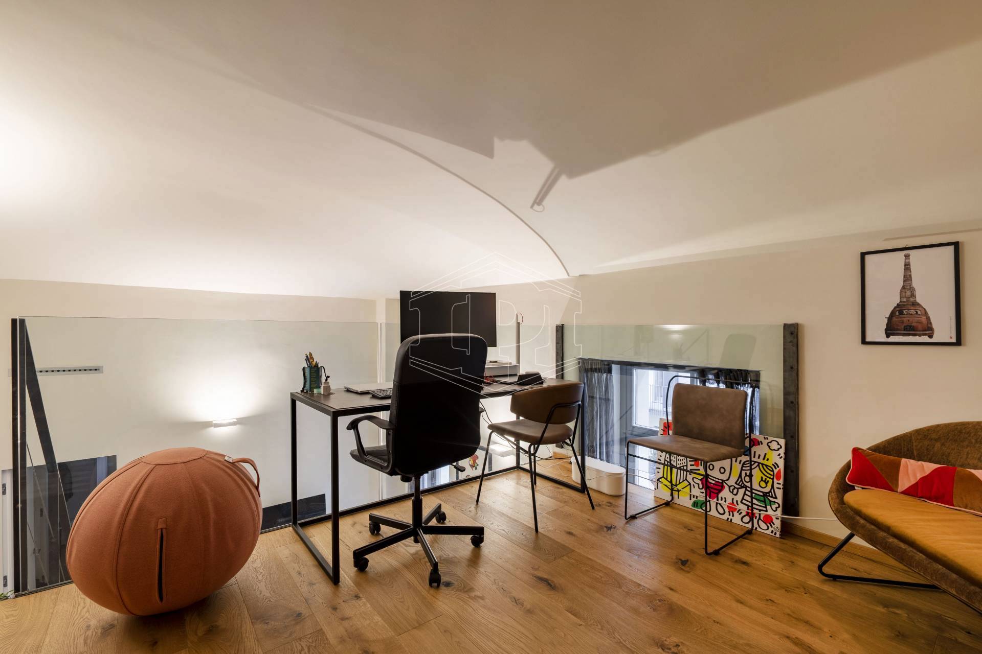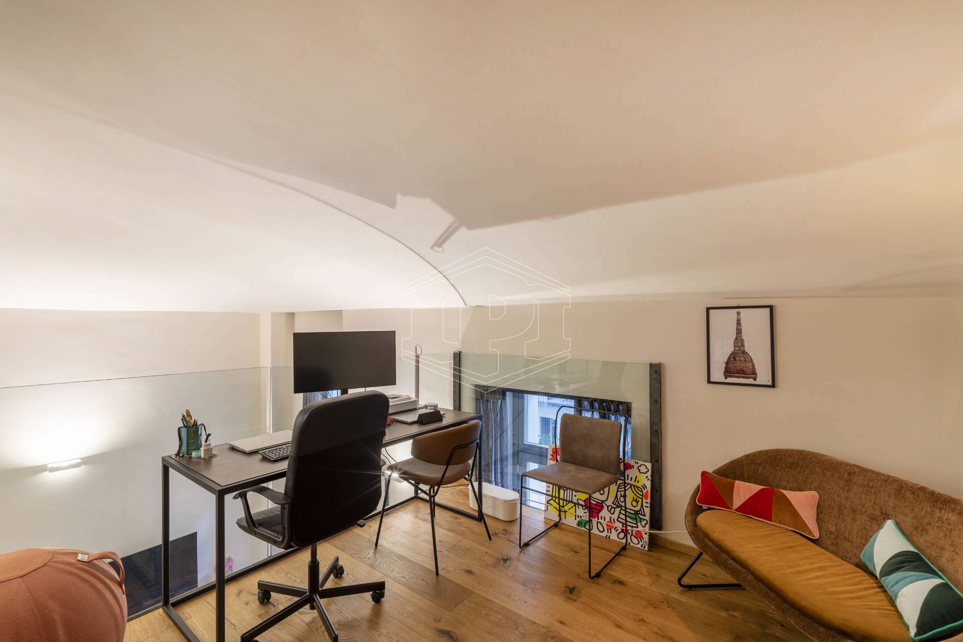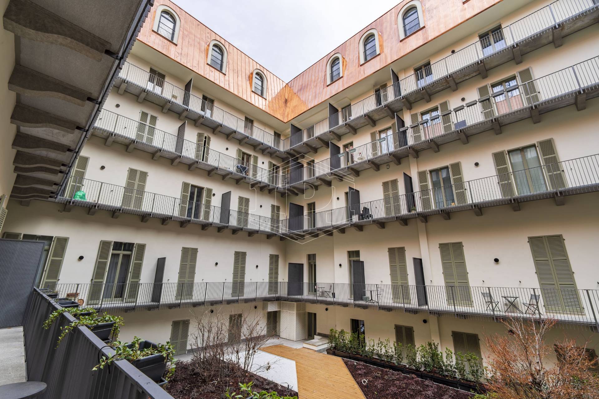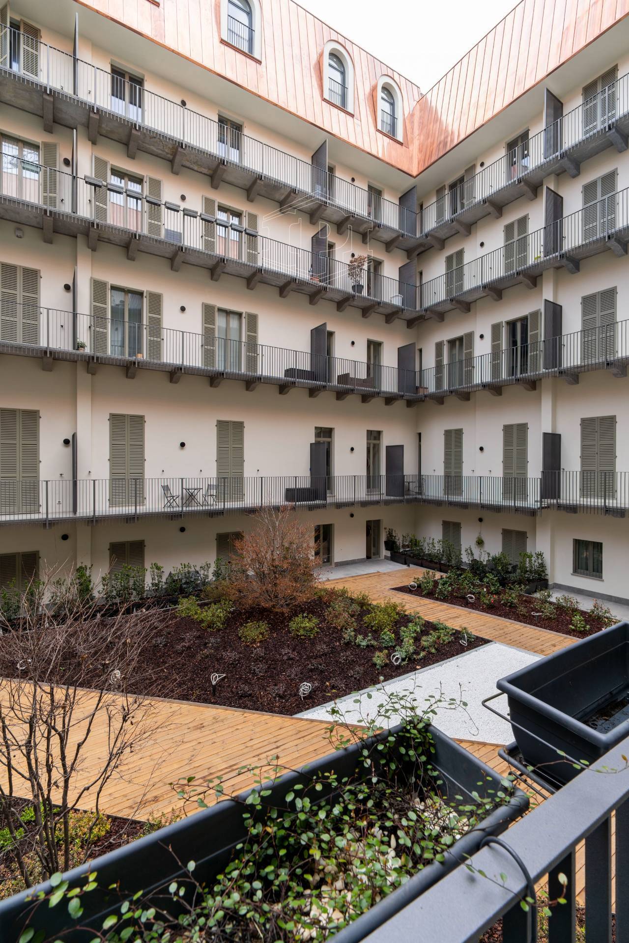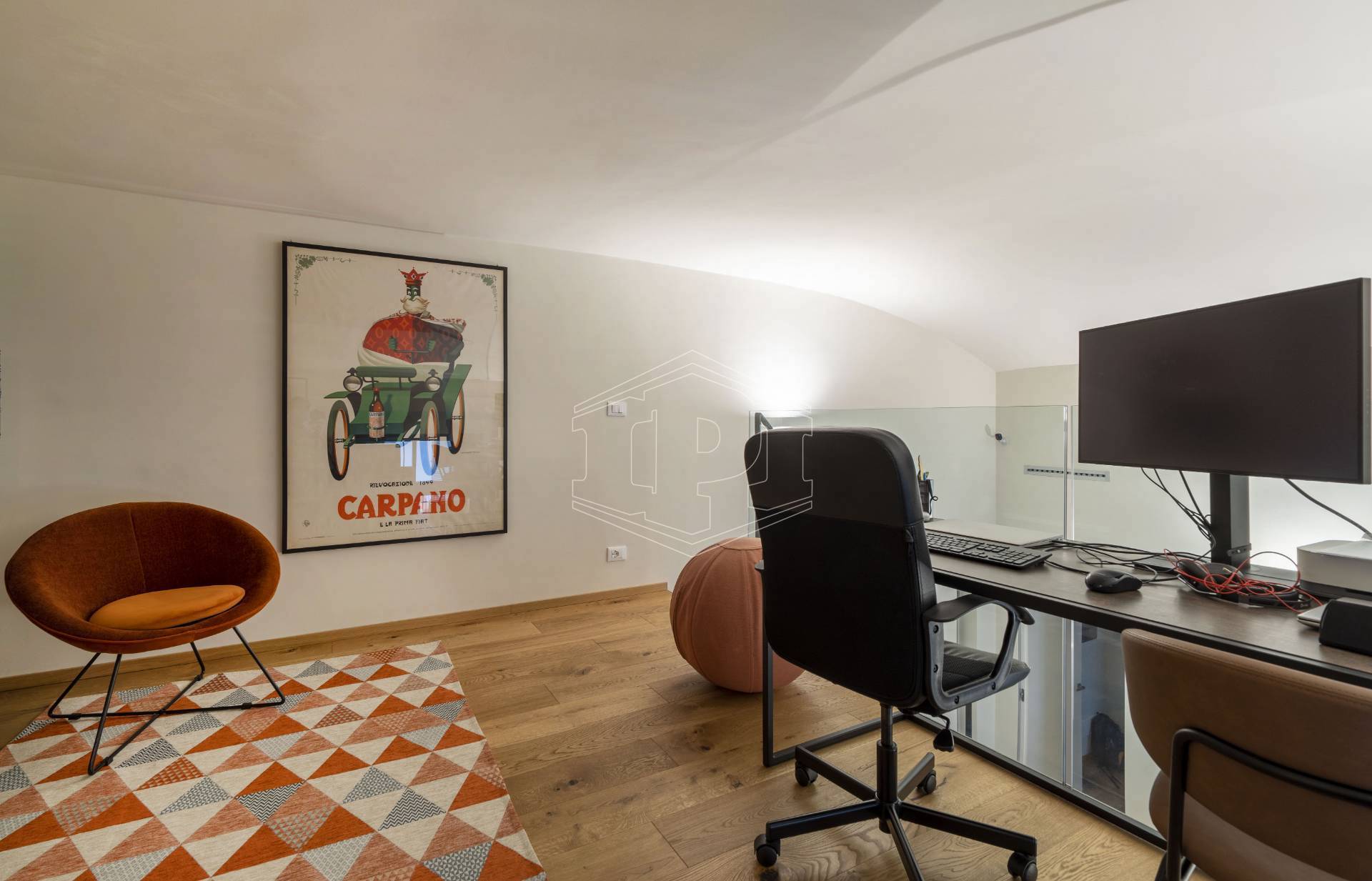 Appartamento completamente arredato di mq 83 composto da: ingresso su soggiorno con cucina collegato a un piano soppalco con zona studio, disimpegno, bagno, una camera da letto con soppalco ad uso cabina armadio, ampio balcone con affaccio su giardino interno.
