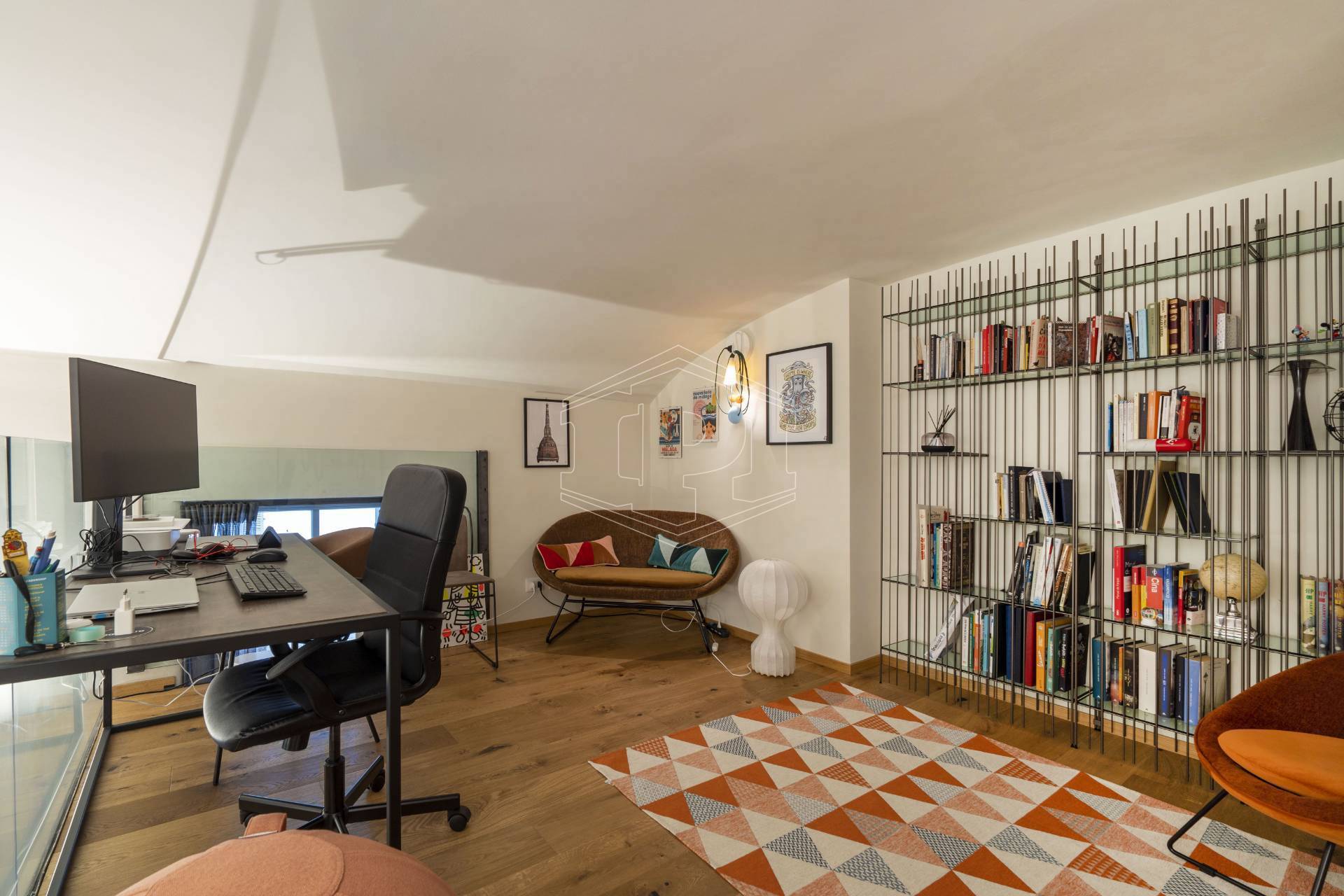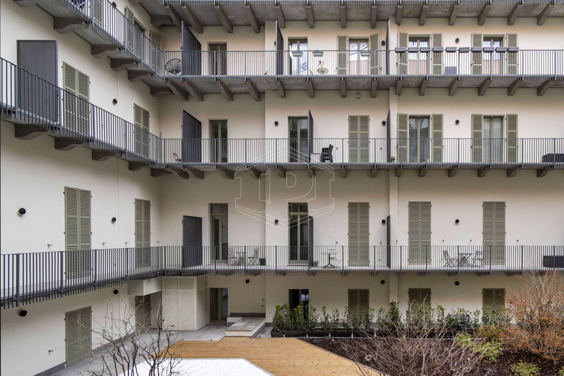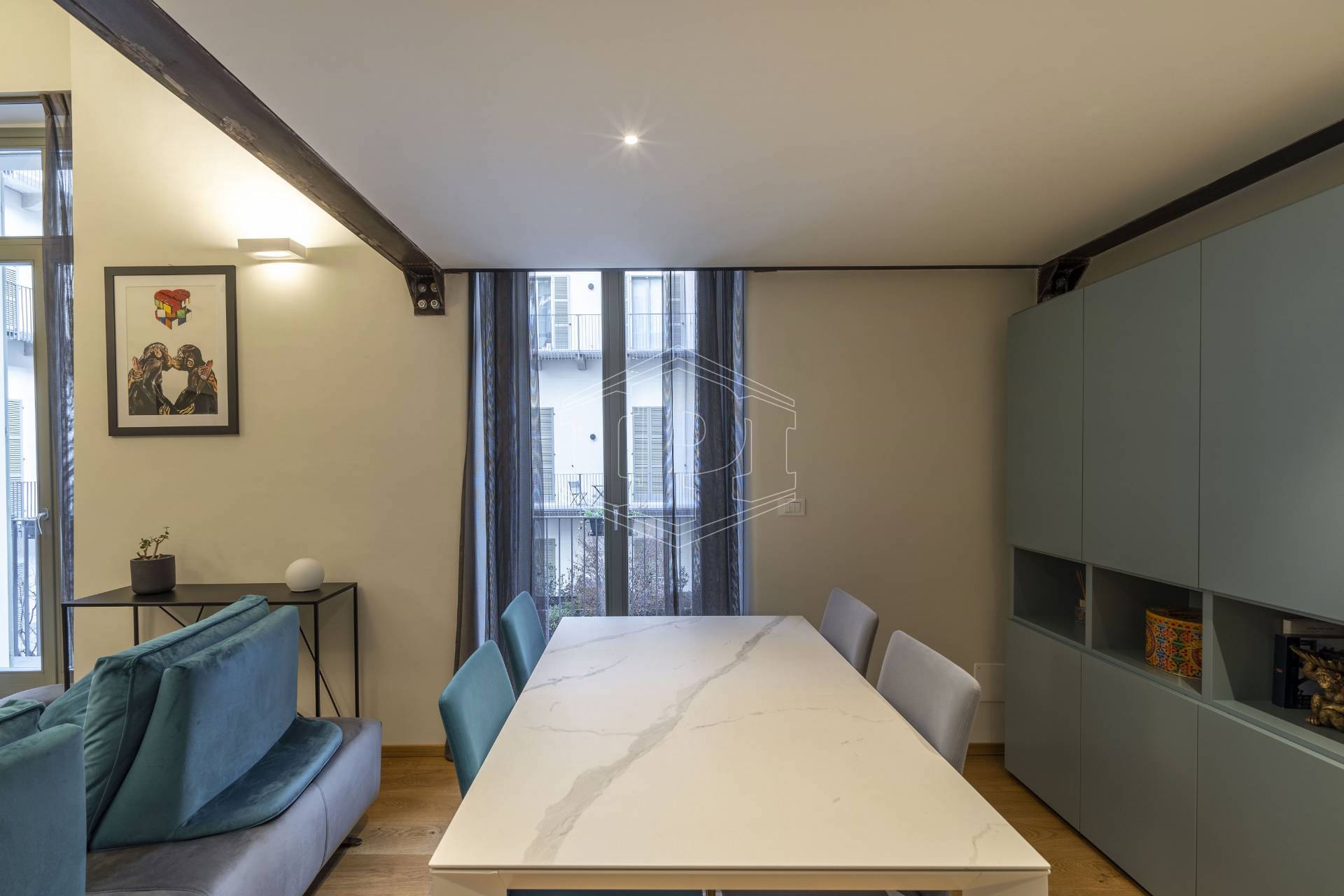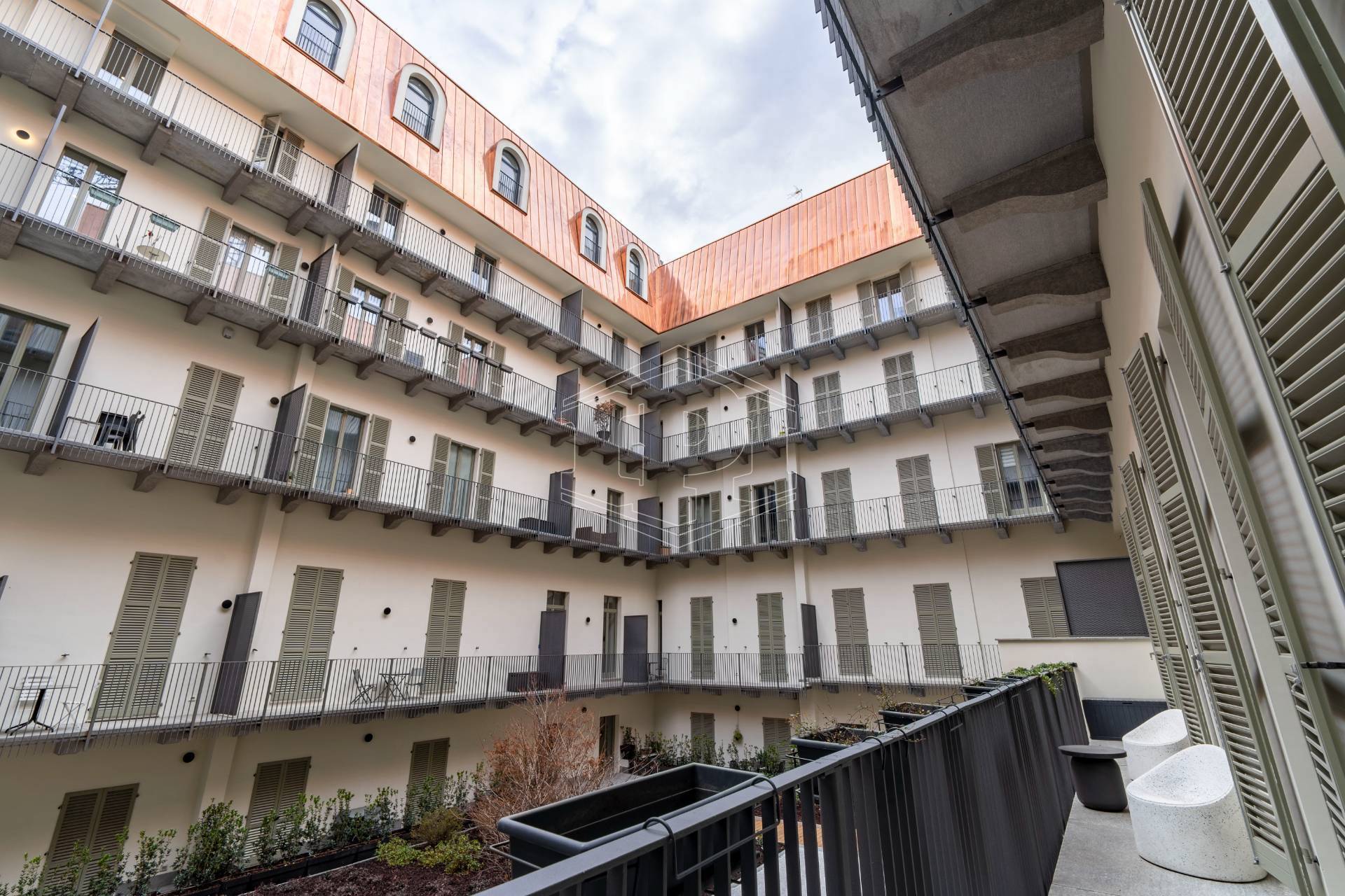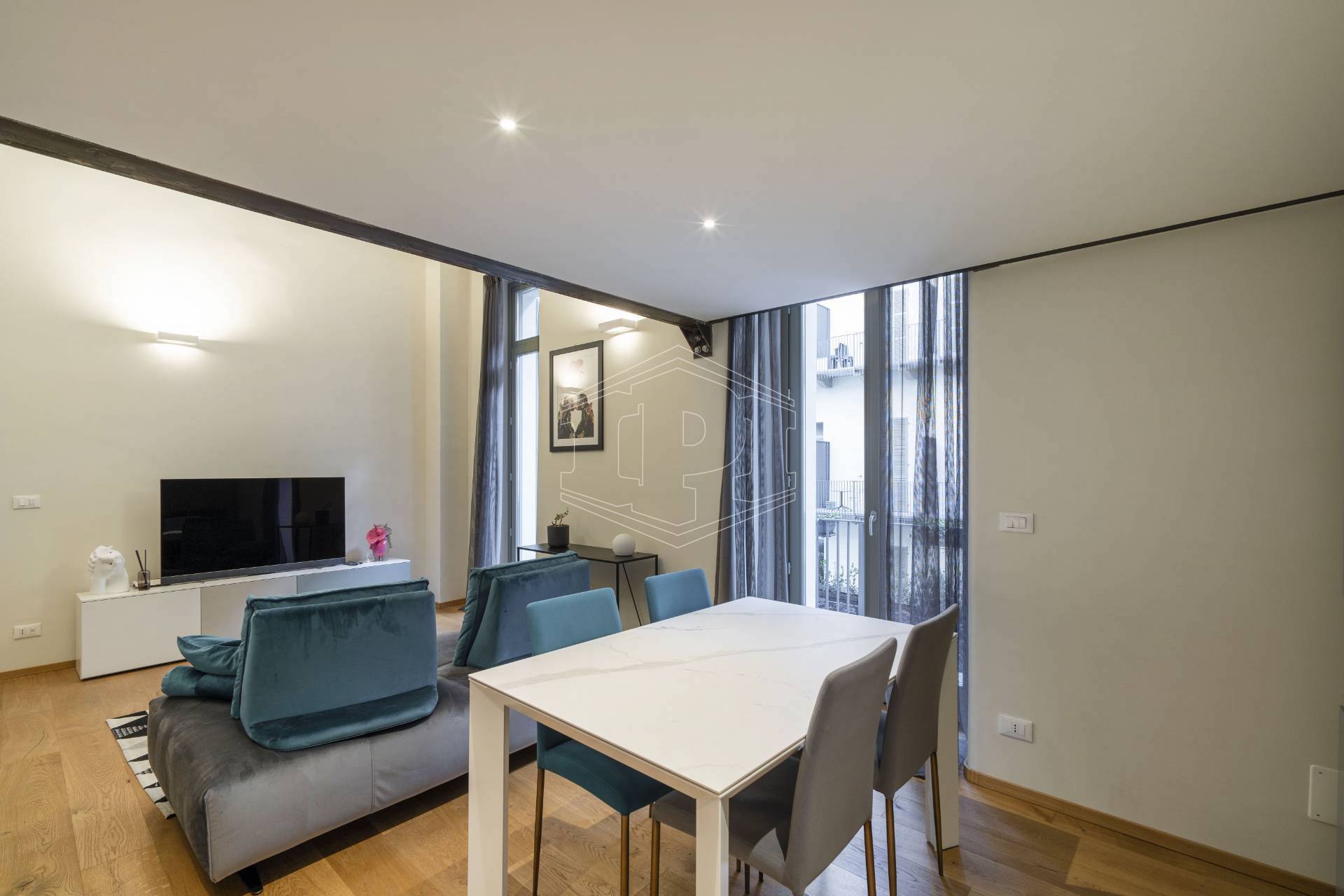 Appartamento completamente arredato di mq 83 composto da: ingresso su soggiorno con cucina collegato a un piano soppalco con zona studio, disimpegno, bagno, una camera da letto con soppalco ad uso cabina armadio, ampio balcone con affaccio su giardino interno.