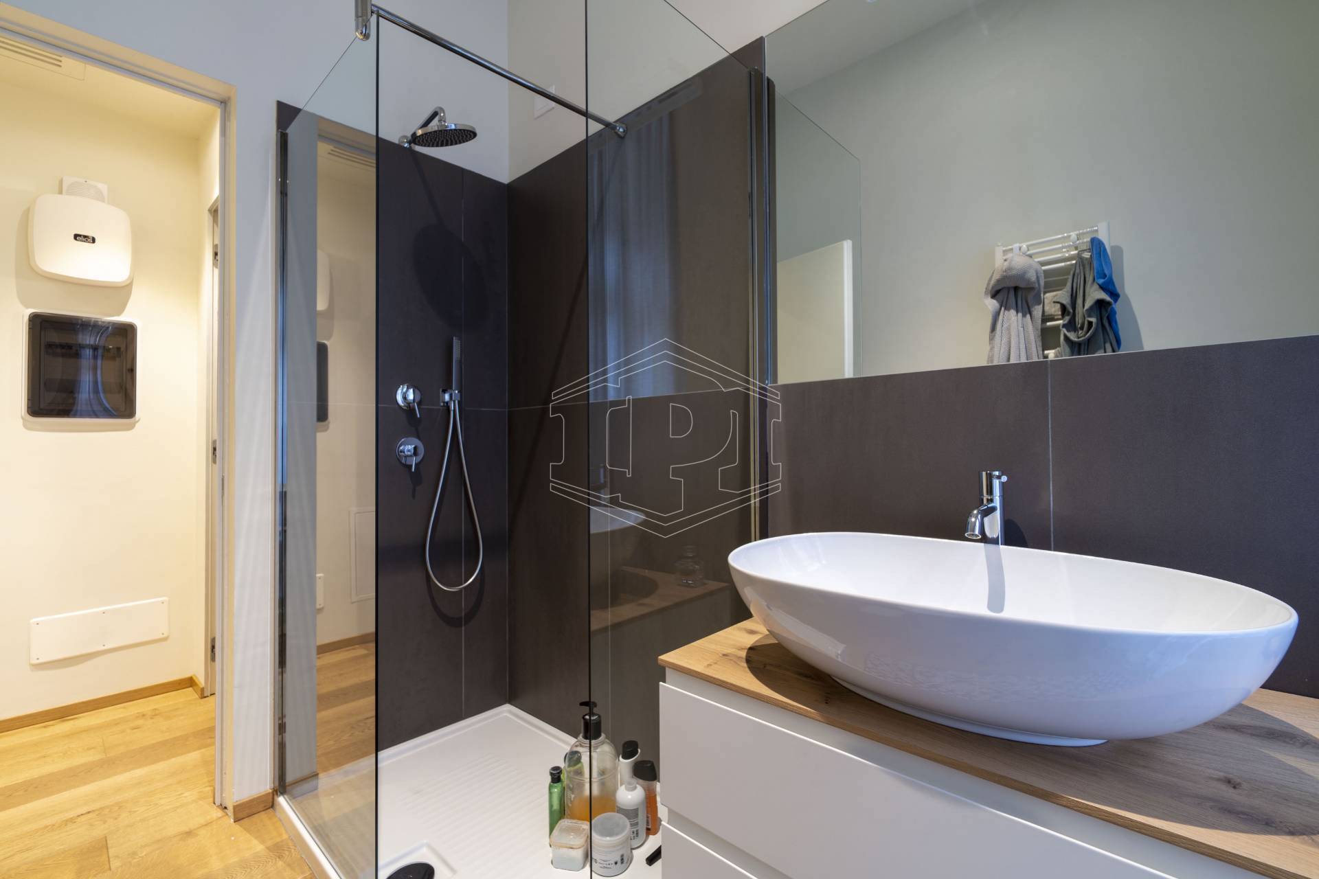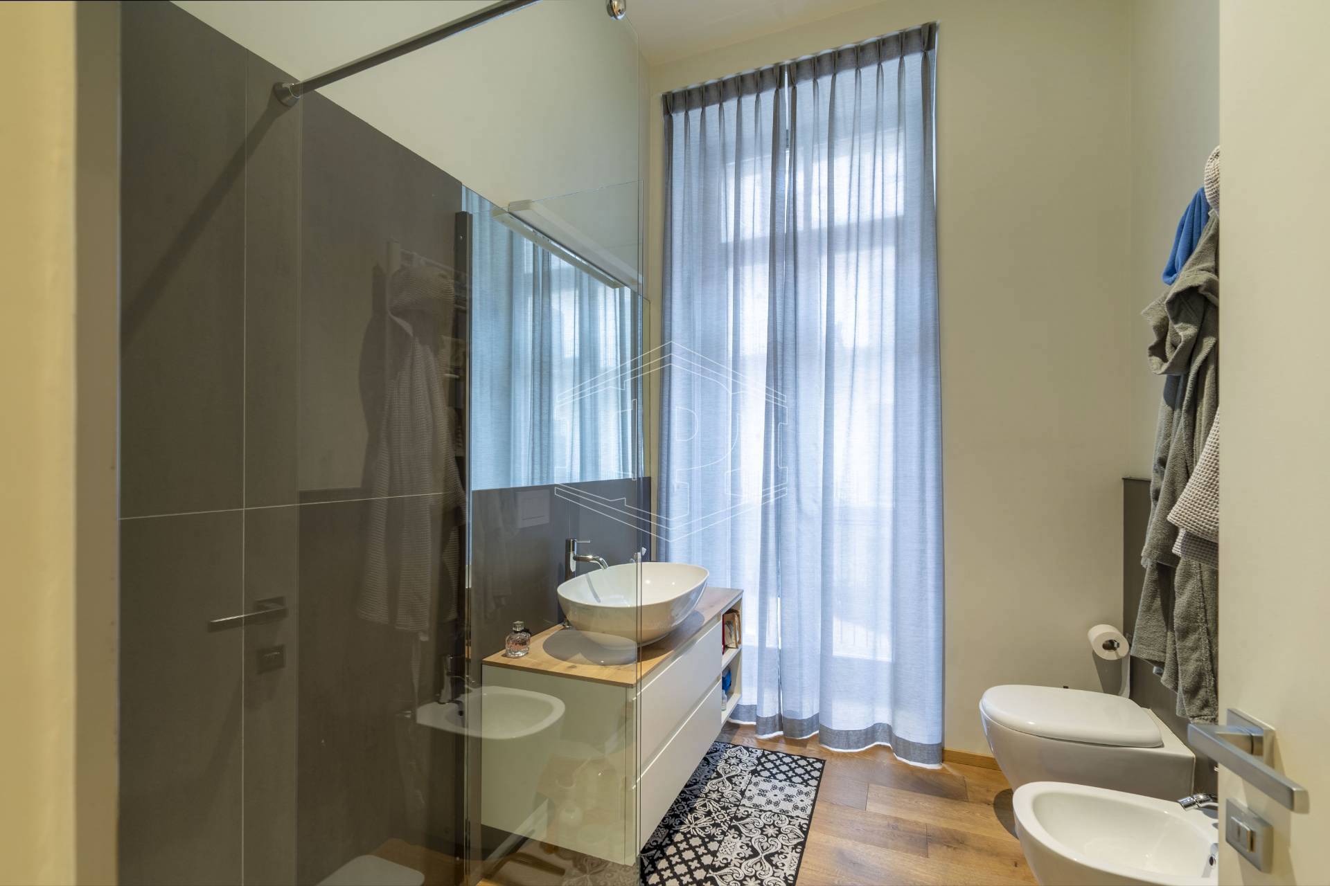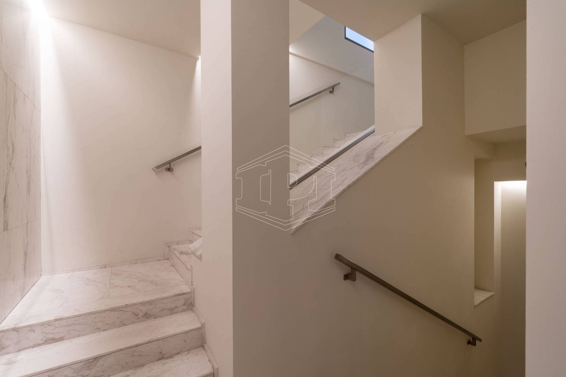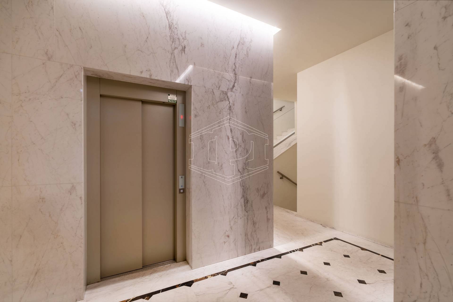 I pavimenti sono in parquet in tutta l'abitazione; i serramenti esterni sono in legno con vetro camera e l'oscuramento è ottenuto da persiane in legno. Il portoncino di ingresso è di tipo blindato e l'alloggio è già dotato di impianto antifurto. Il riscaldamento e il raffrescamento sono a pavimento, impianto centralizzato con contabilizzatore. Le spese condominiali ammontano a circa 2.000 Euro/anno, comprese anche spese di riscaldamento e raffrescamento. L'appartamento è sito al secondo piano di sette, con ascensore, e gode di esposizione a sud-est.