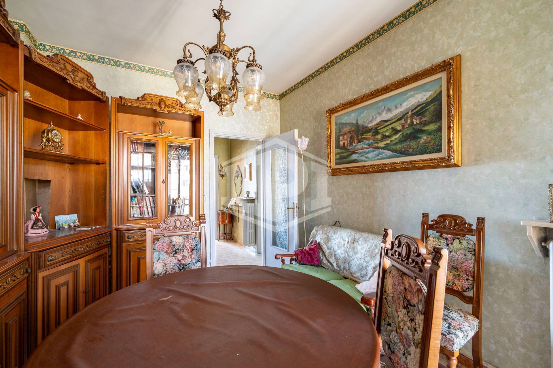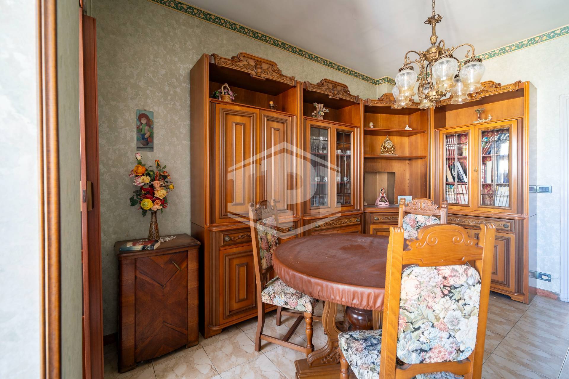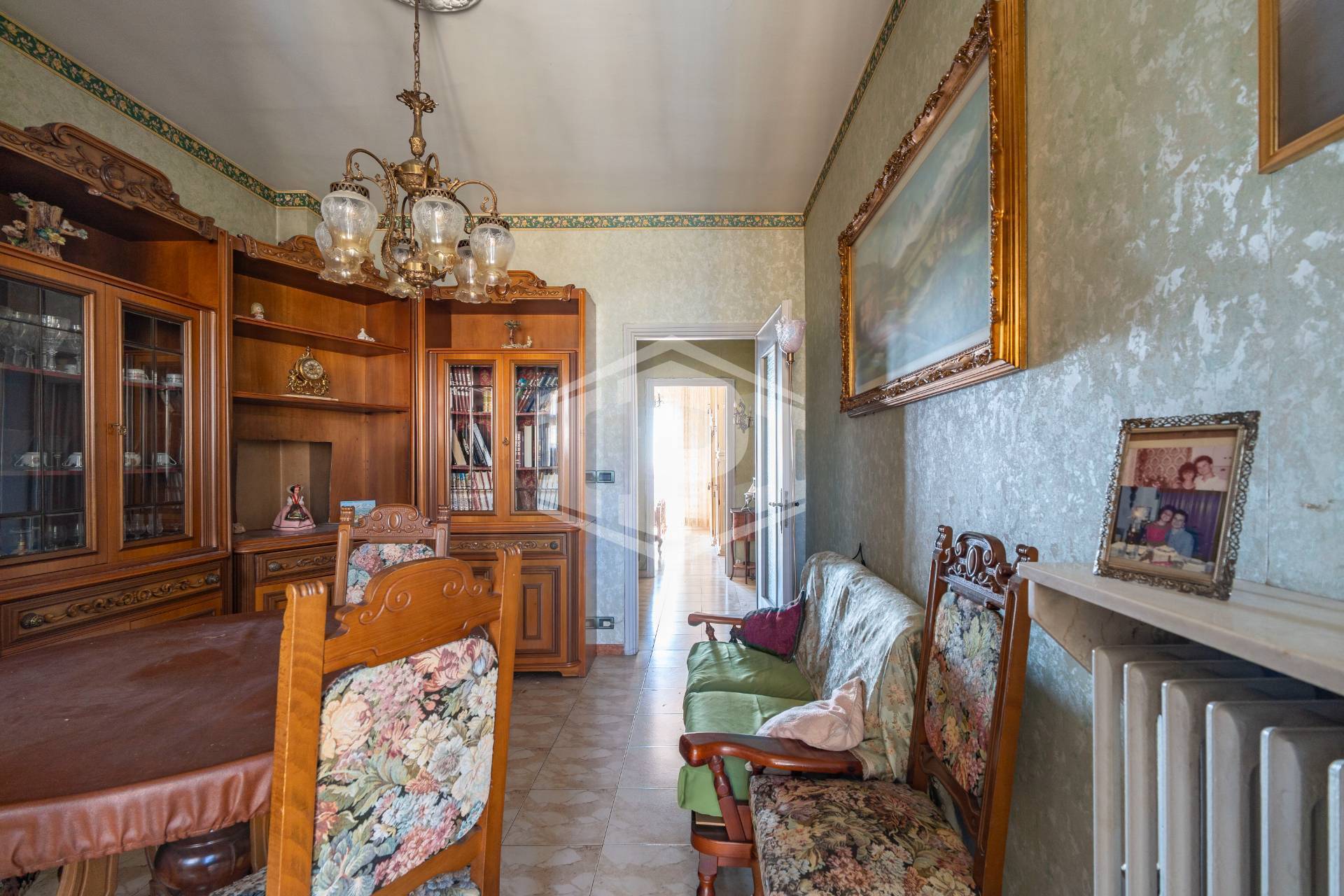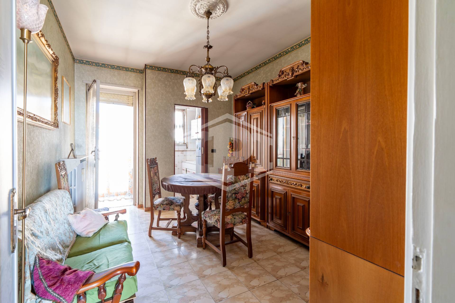 I pavimenti sono in marmo ad eccezione di bagno e cucina dove è presente la ceramica, gli infissi esterni sono in legno con vetro semplice e l'oscuramento è ottenuto da tapparelle. Il riscaldamento è centralizzato con termo valvole, a metano. L'alloggio si presenta in stato originale ed è particolarmente luminoso e panoramico.