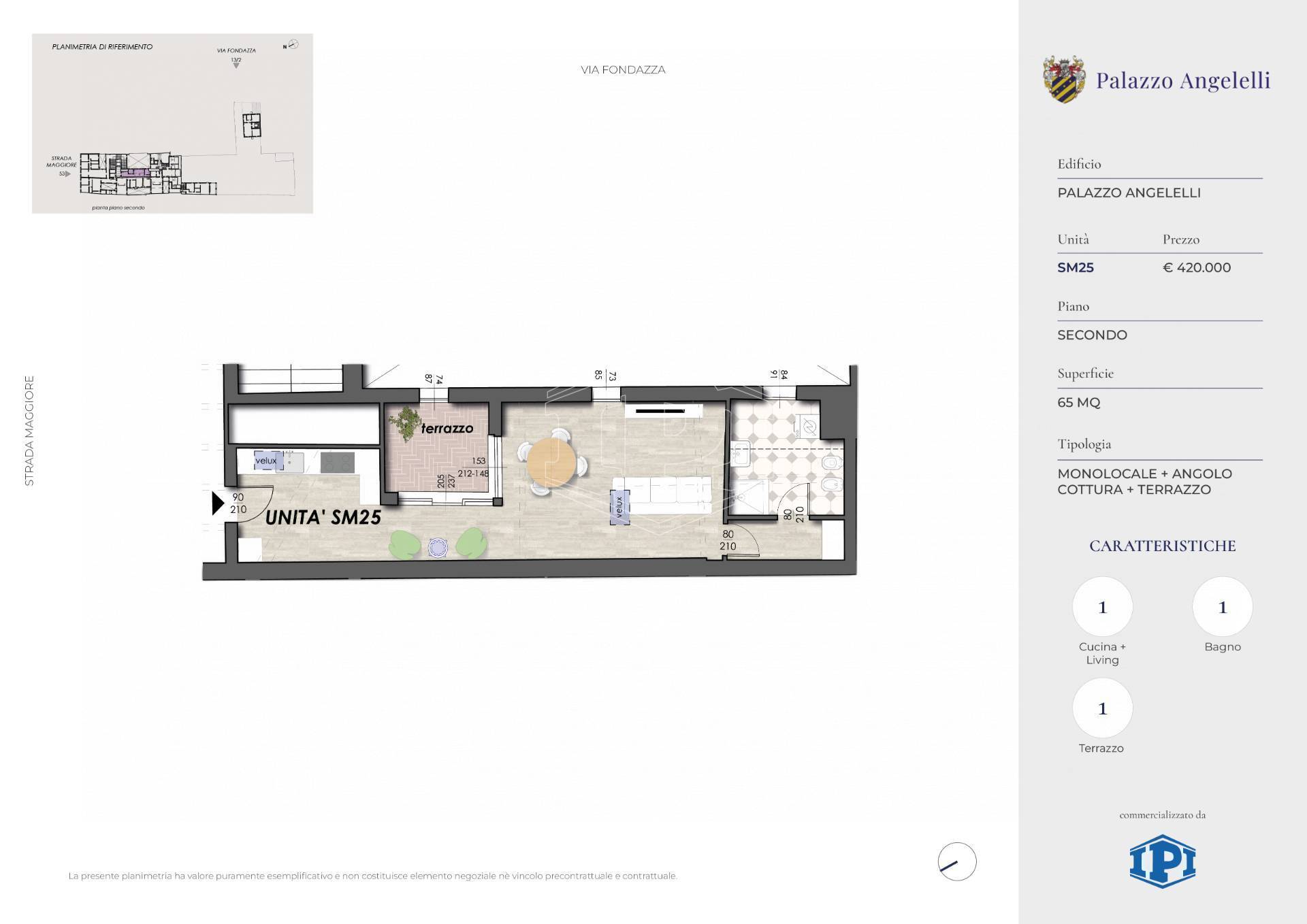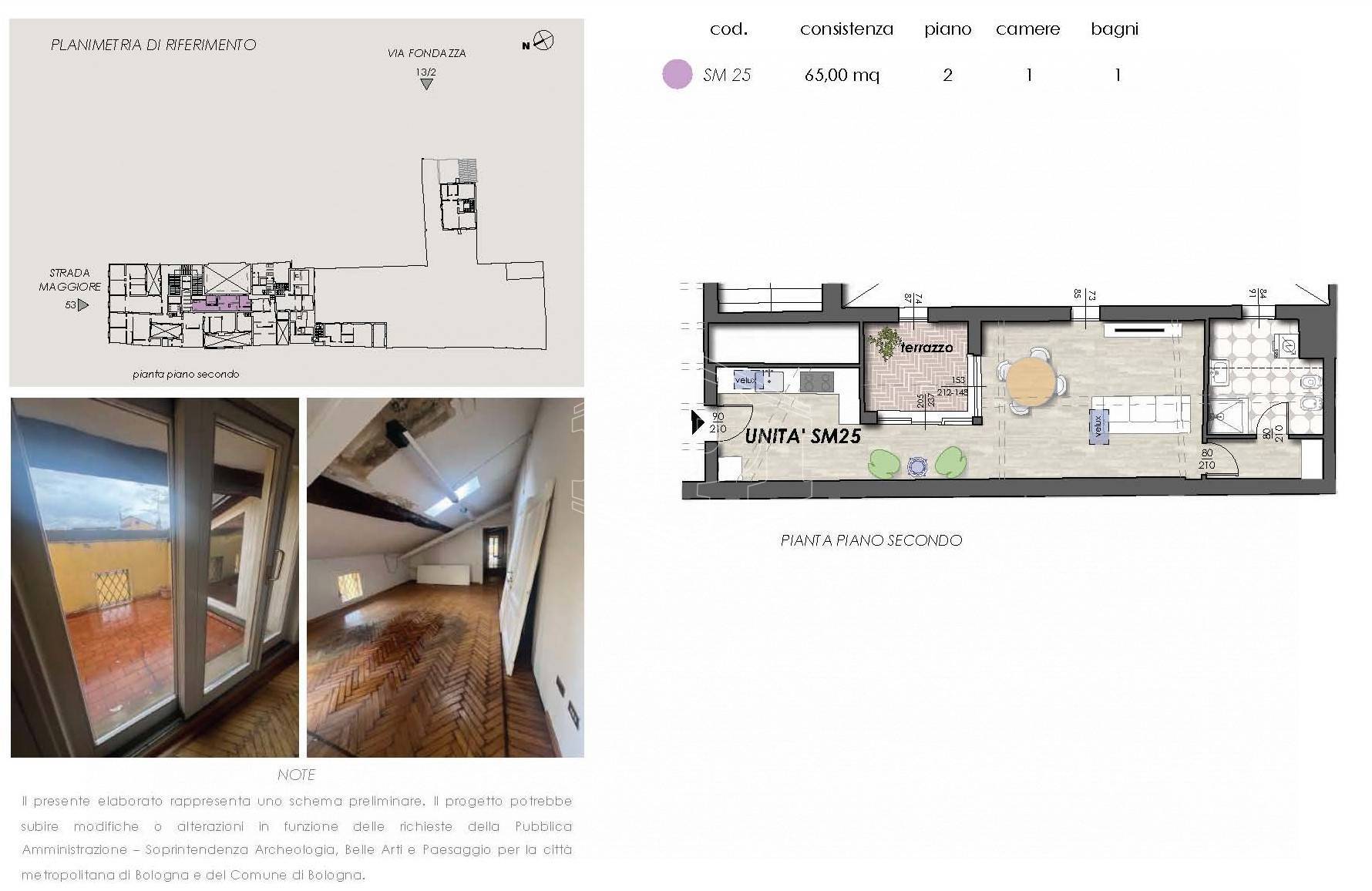 Centro Storico - Strada Maggiore - In stabile antico e prestigioso, Palazzo Angelelli, graziosa Mansarda con terrazzo ad asola con splendida vista sui tetti. Ingresso su zona giorno con angolo cottura, disimpegno con vetrata scorrevole per accesso al terrazzo di mq 5,5 circa, open-space con zona giorno/notte, bagno con antibagno-ripostiglio.