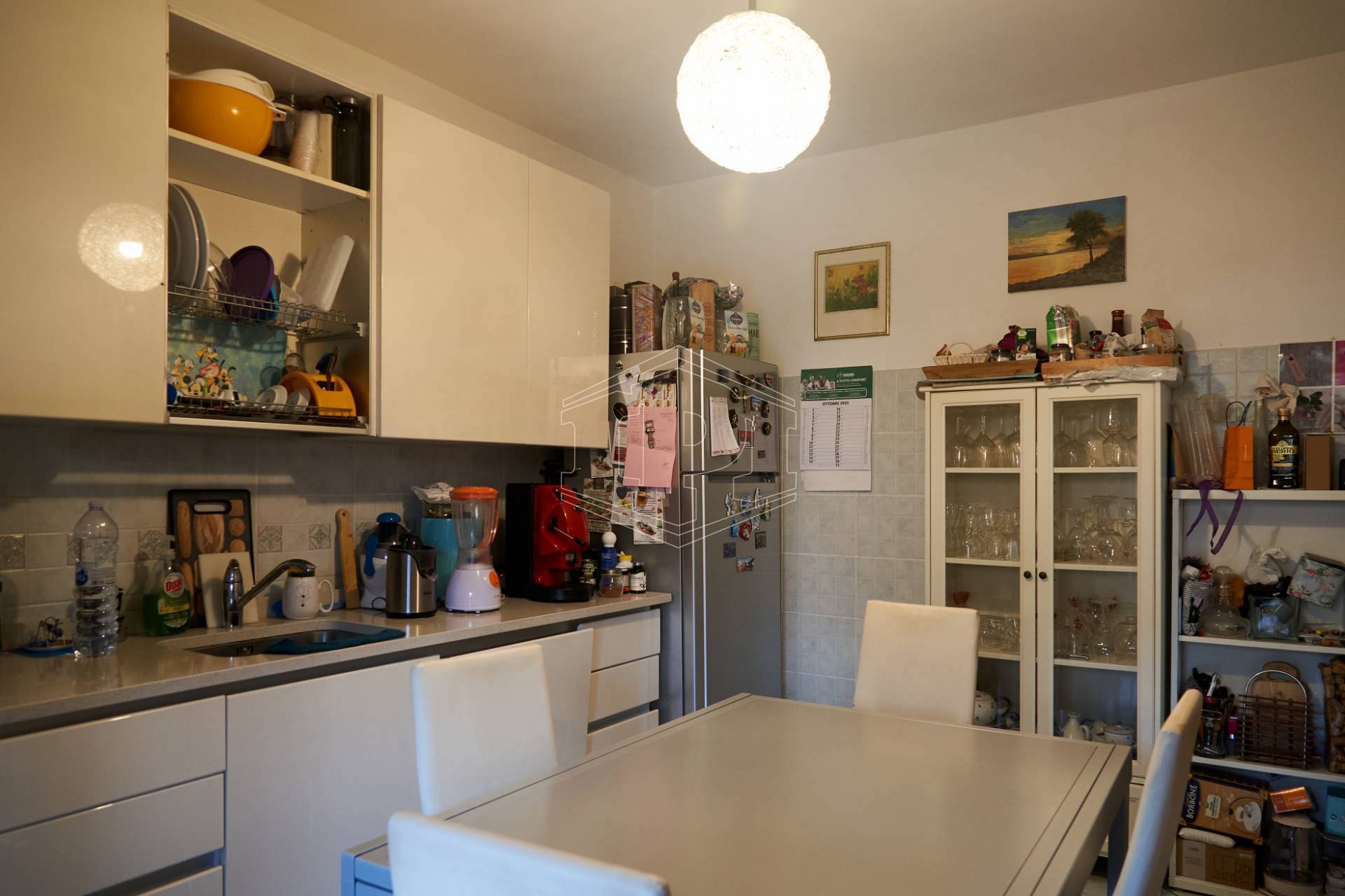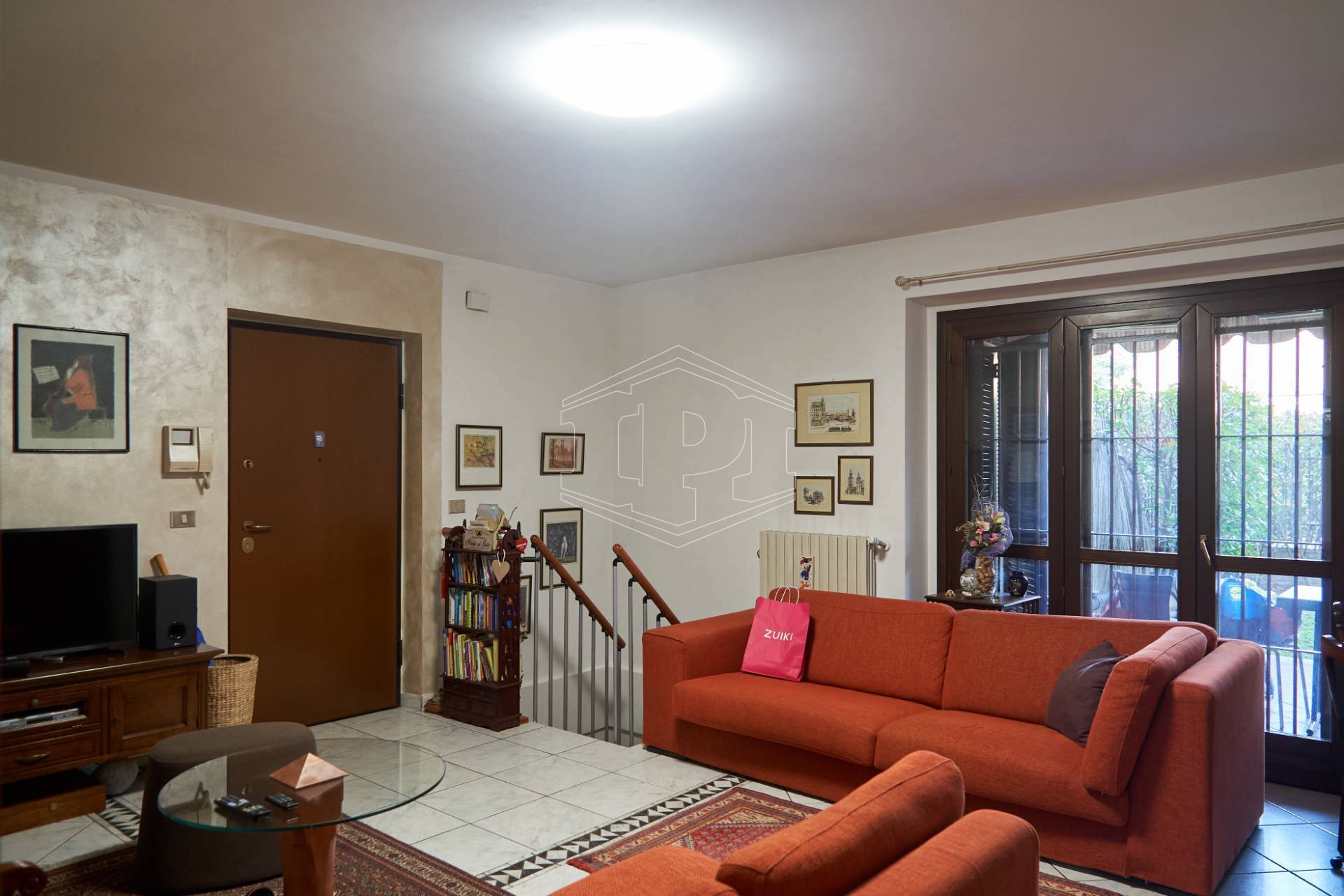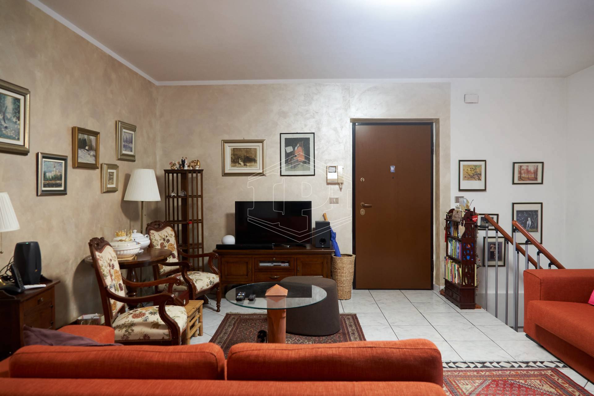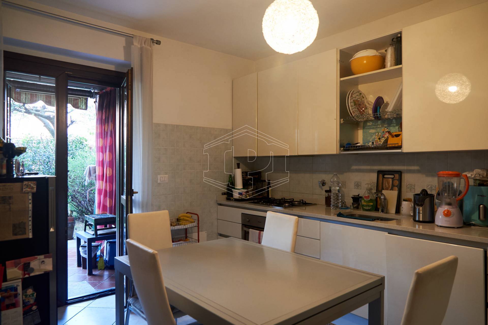 Appartamento di 111 mq, composto da: ingresso living in soggiorno, cucina abitabile, due camere, doppi servizi, ripostiglio, due giardini rispettivamente di 50 e 100 mq. Completano la proprietà il box auto e la cantina/tavernetta al piano interrato con accesso dall'interno. Il box auto è di 20 mq, è dotato di porta basculante elettrica e area di manovra molto comoda.