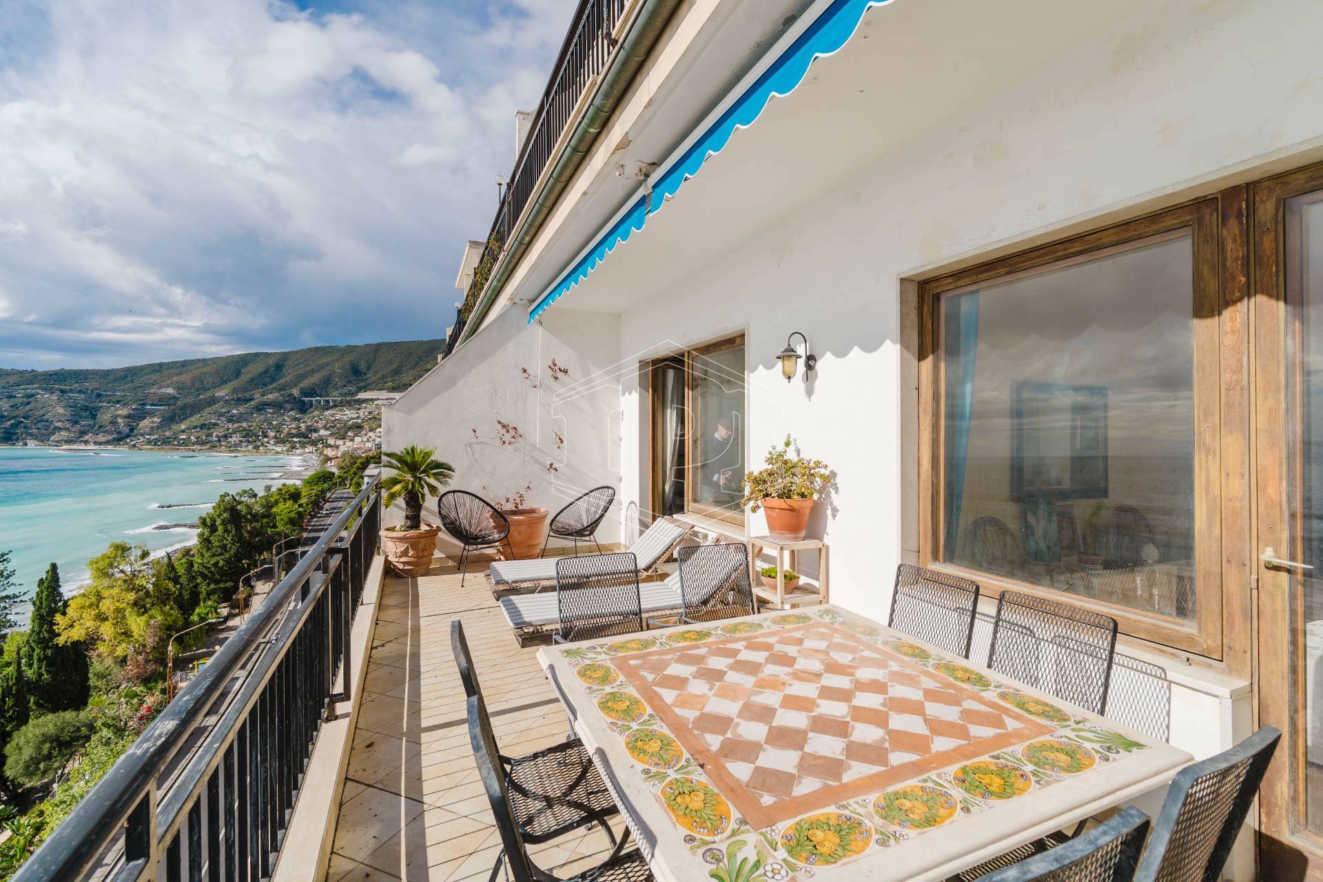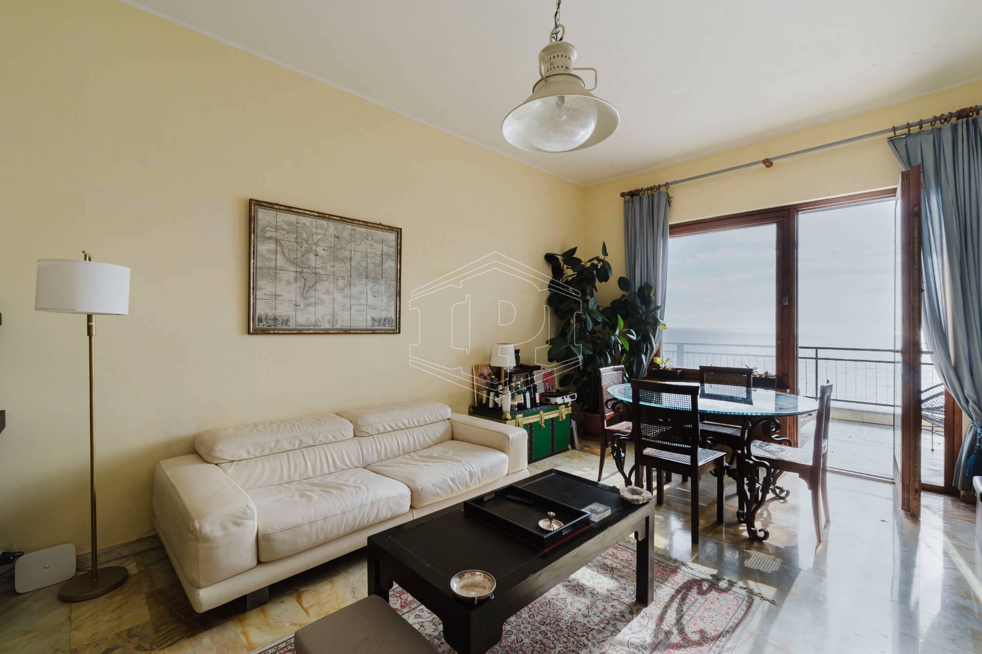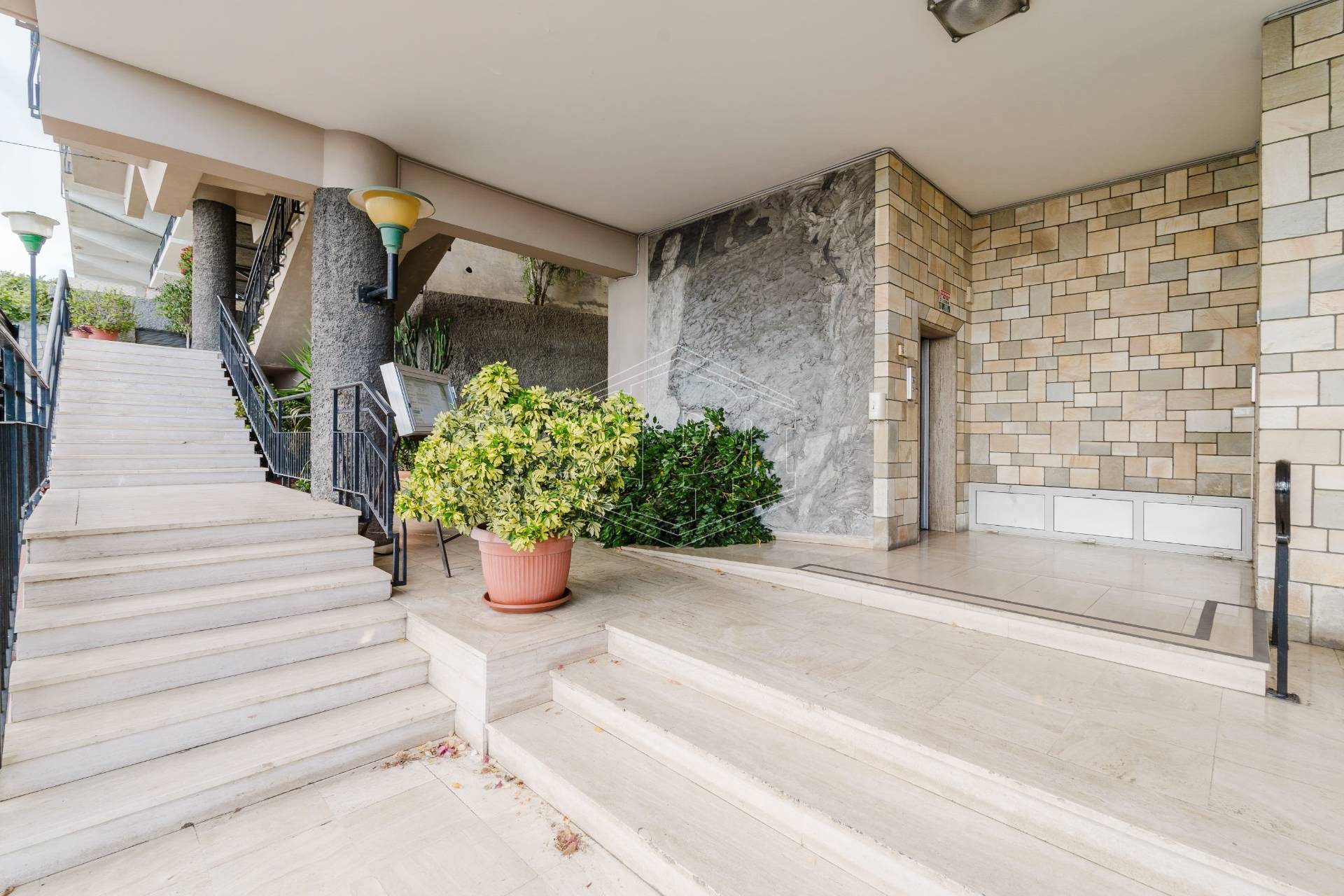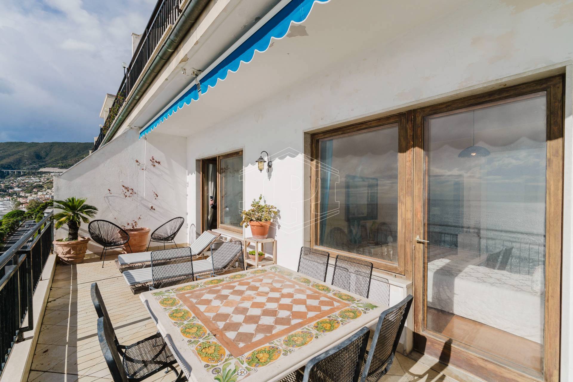 Appartamento di 99 mq calpestabili, oltre a terrazzo di 24 mq, composto da ingresso, salone doppio con accesso al terrazzo vista mare, cucina, due camere da letto di cui una con bagno interno dotato di doccia, altro bagno con vasca. Completano la proprietà un altro terrazzino a monte, un comodo parcheggio condominiale e volendo l'uso di due piscine condominiali poste sul tetto del condominio.