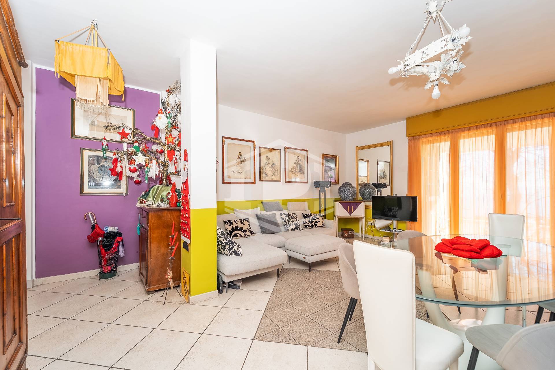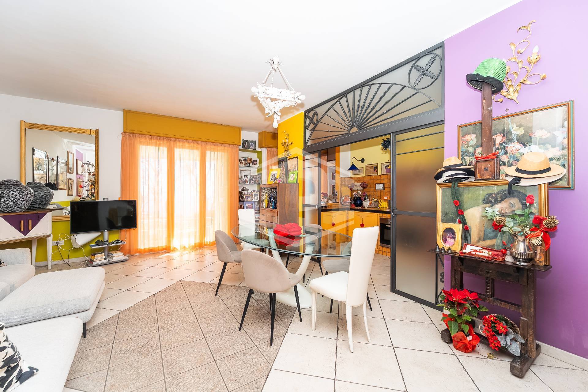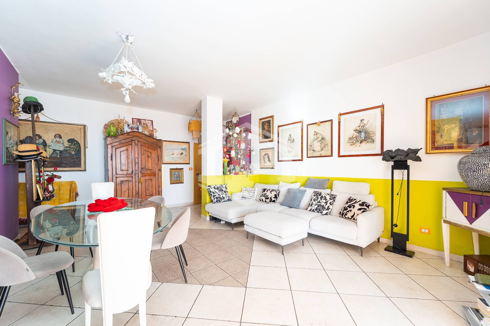 L'ingresso conduce a un ampio salone con cucina a vista separabile tramite porta scorrevole, che si affaccia su un balcone-terrazzo di circa 25 mq con affaccio libero e panoramico.